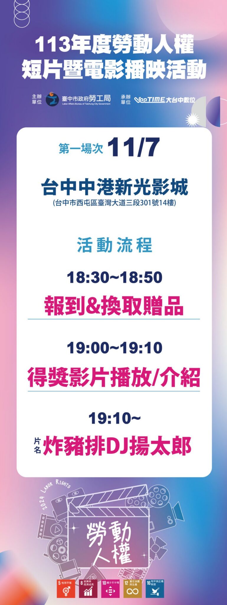 為增進社會大眾對勞動議題、勞動法令的關注,並促進職場平權、加強性別平等工作觀念,台中市政府勞工局特舉辦「113年度勞動人權電影播映活動」,邀請民眾一同來觀賞電影。此次活動共計3個場次,分別於今年11月7、11、 12日於台中中港新光影城播映「炸豬排 DJ 揚太郎」、「女力拳開」及「角落辦公室」3部與勞動人權議題相關電影,並於電影正片開始前播映今年勞工局短片徵選活動社會組首獎作品「什麼老闆都有」及學生組首獎作品「勞工的七大不合理事件」,每場次開放200位民眾報名。