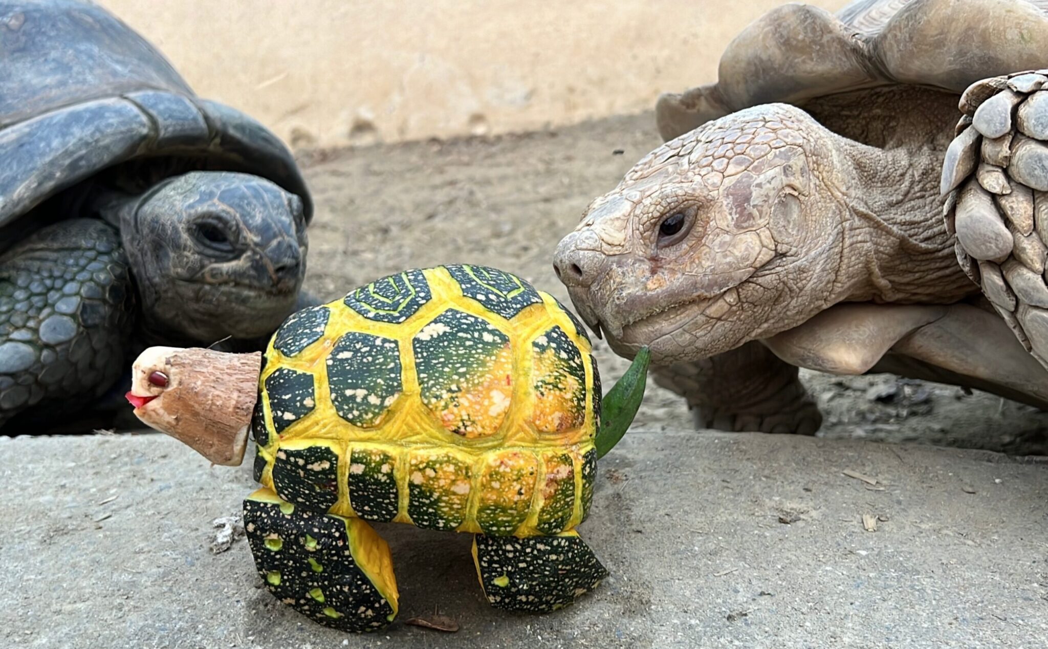 圖說:象龜好奇觀察南瓜造型烏龜。(觀光局提供)