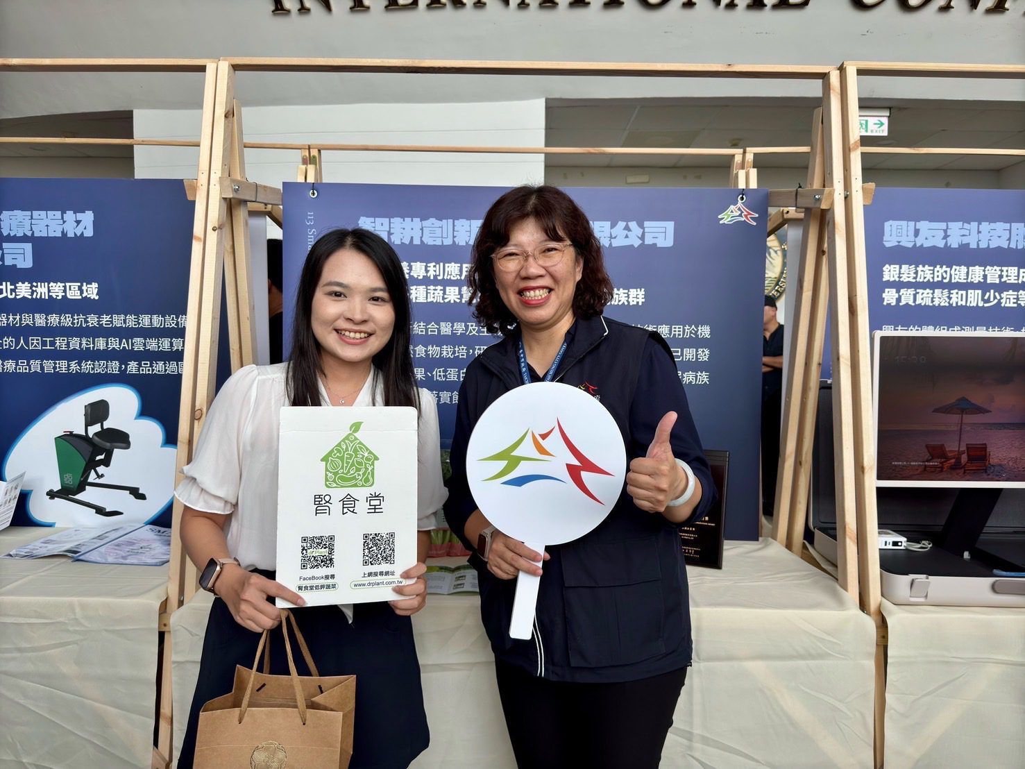 張局長說明,台中產業近年積極研發升級,切入高附加價值、高技術含量產品,更關注長照與健康需求。如此次參展的「興友科技」為中興大學興創基地孵化育成的新創公司,迄今已累積超過20項多國專利,擁有世界唯一經由實證的生物阻抗分析測量人體骨密度技術,開發具備醫療認證等級的「具骨質密度量測之多功能體組成分析儀」,協助銀髮族及行動不便者精準掌握肌肉質量及骨質密度,有效進行健康管理;同樣來自興創基地的「智耕創新」則開發「低鈉產業」幫助腎友進行飲食管理,共同創辦人黃明發想要替身邊慢性病的家人解決飲食上的困擾和不便利,投入糖尿病飲食療法,首創高鉻含量天然蔬果為糖尿病患者提供更健康的膳食選擇,提升生活品質。