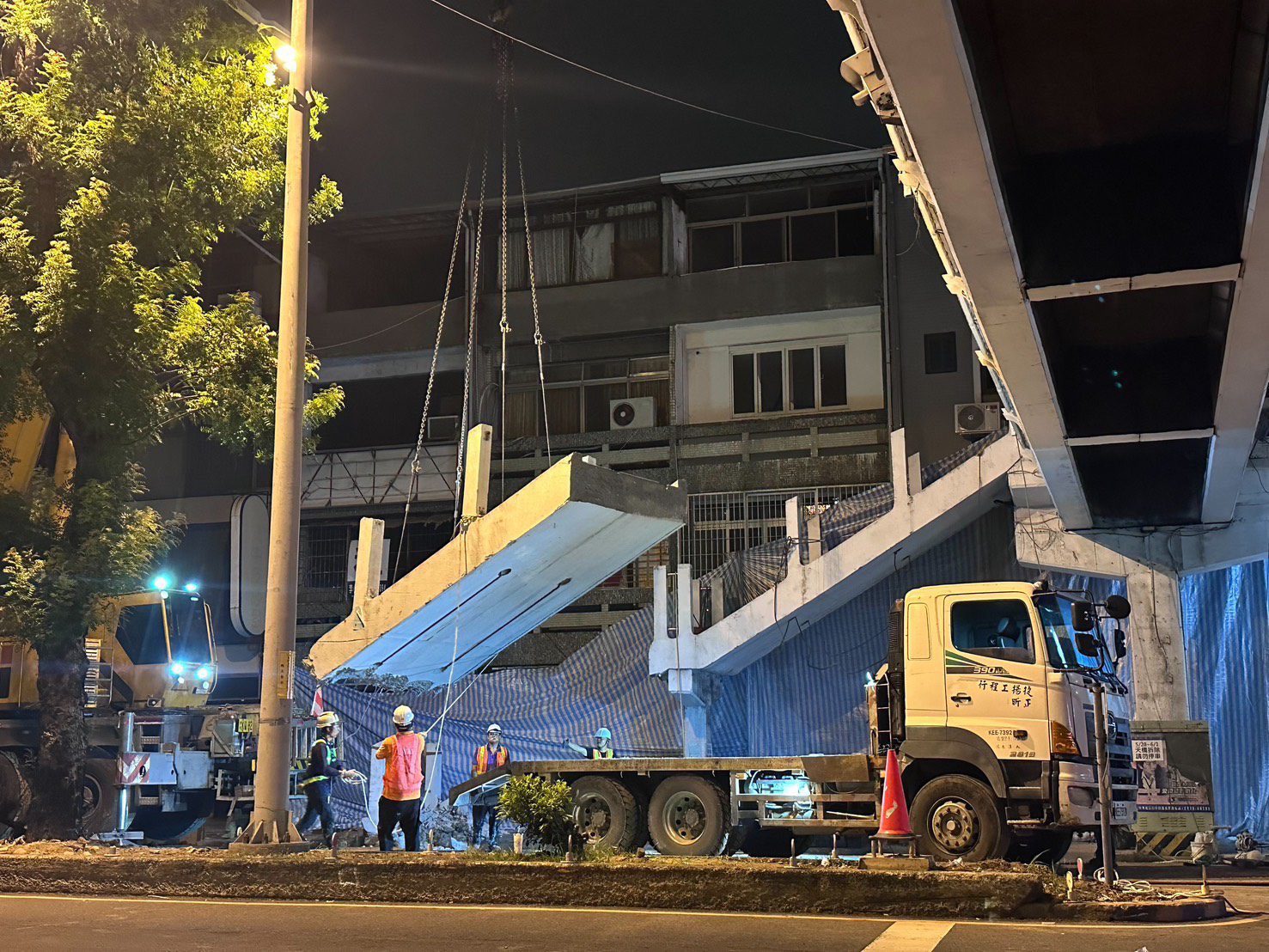 陳大田局長表示,中清路大鵬路天橋使用年限已久,影響視覺景觀與通行便利性,且造成行人通行不便,經評估後規劃拆除並同步進行人行道拓寬、行穿線退縮、行人停等區優化與無障礙設施整建。拆除作業於5月29日深夜啟動,施工團隊在5月31日晚間一口氣完成兩側主梁吊離作業,大幅壓縮工期,提前一日完成任務,展現高度效率與執行力。