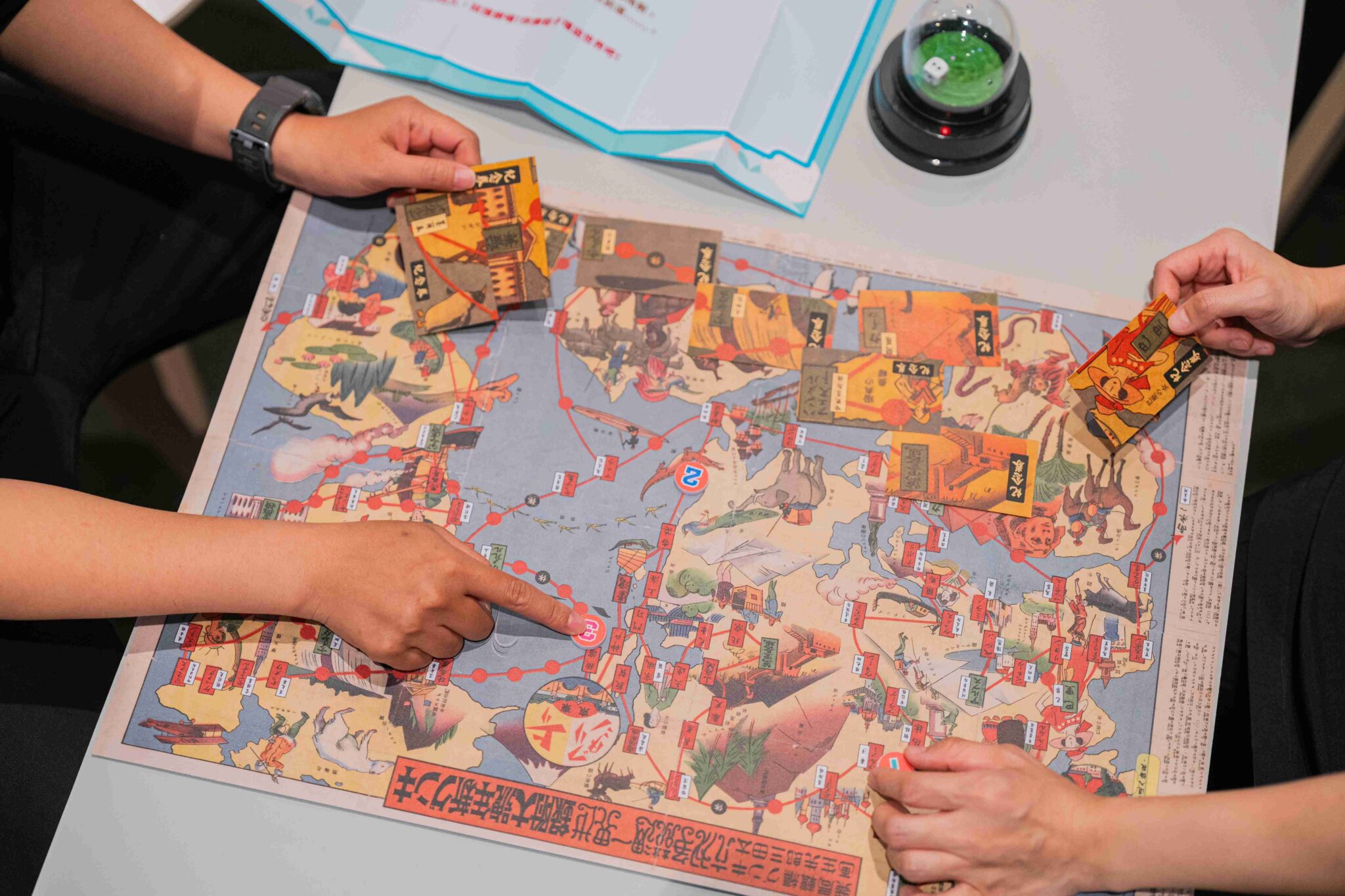桌遊不僅是一種娛樂,更像是一部迷你時光機,隨著時代的流轉,它們帶領我們穿越過去。從遊戲圖面、規則玩法窺見不同時代的社會樣貌與價值觀,例如1934年「南日本新報社」發行的臺北觀光桌遊,清楚地記錄了日本時代臺北車站前的熱鬧街景與知名商家,特展中以桌遊藏品對照館藏老照片實景與多媒體互動,帶領觀眾體驗穿越舊時代的趣味;清代「升官圖」則記載了清朝官職晉升制度,到戰後又出現「一府五院」體制的競賽桌遊。除此之外,還有別具傳統特色的中式撲克牌,竟然是以「天干地支」來表現牌組,展現出有別於西式的獨特型態。