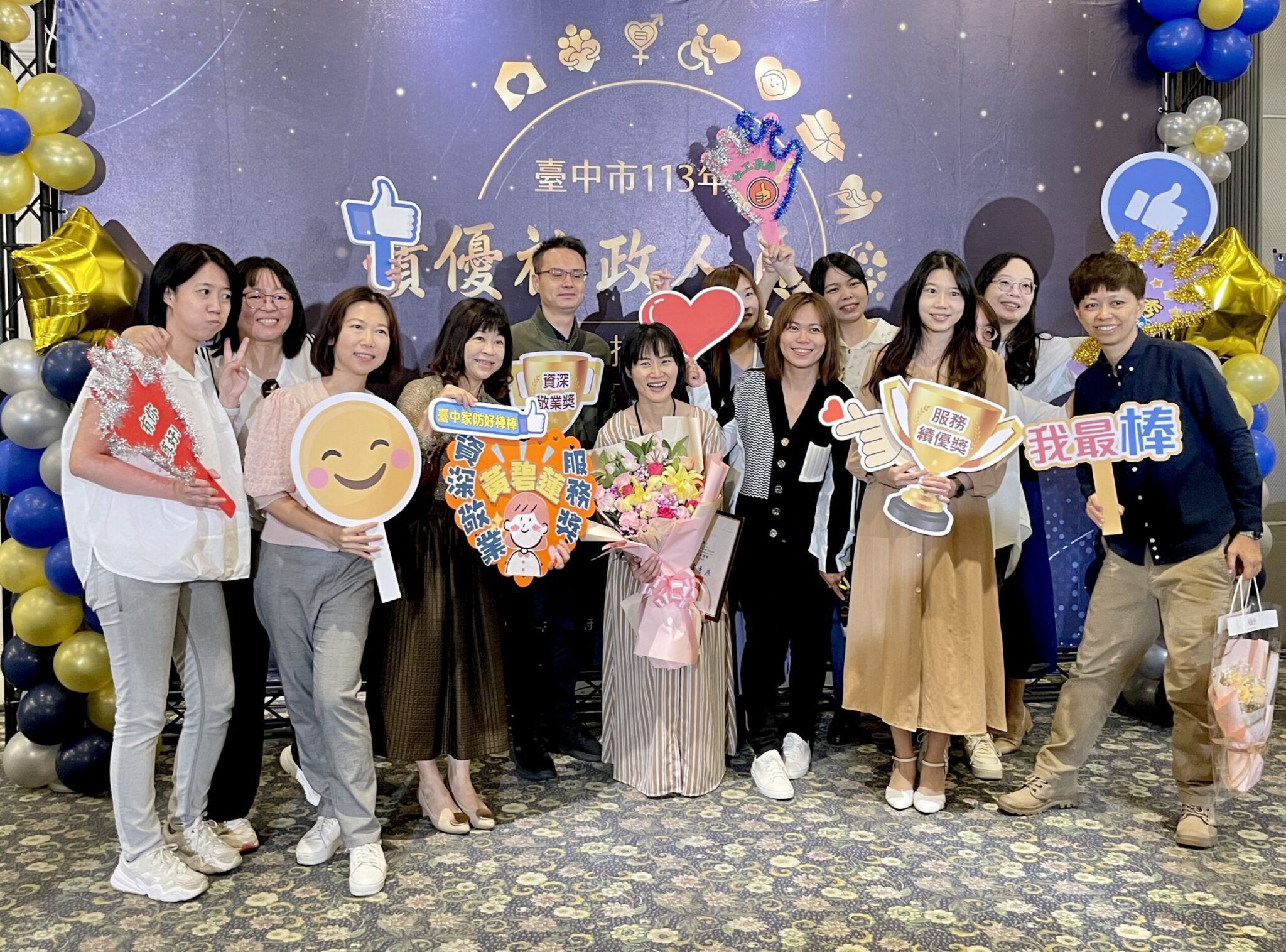 社會局指出,長青福利科股長吳佳燕不僅榮獲台中市資深敬業服務獎,也同時獲得衛生福利部全國績優社政人員服務績優獎,殊為不易。吳股長帶領團隊推動社區照顧關懷據點突破500處,期間獲得「社區金點獎」,更首創據點全明星運動會,積極投入長者及社區服務,展現熱忱,帶領同仁共同成長。