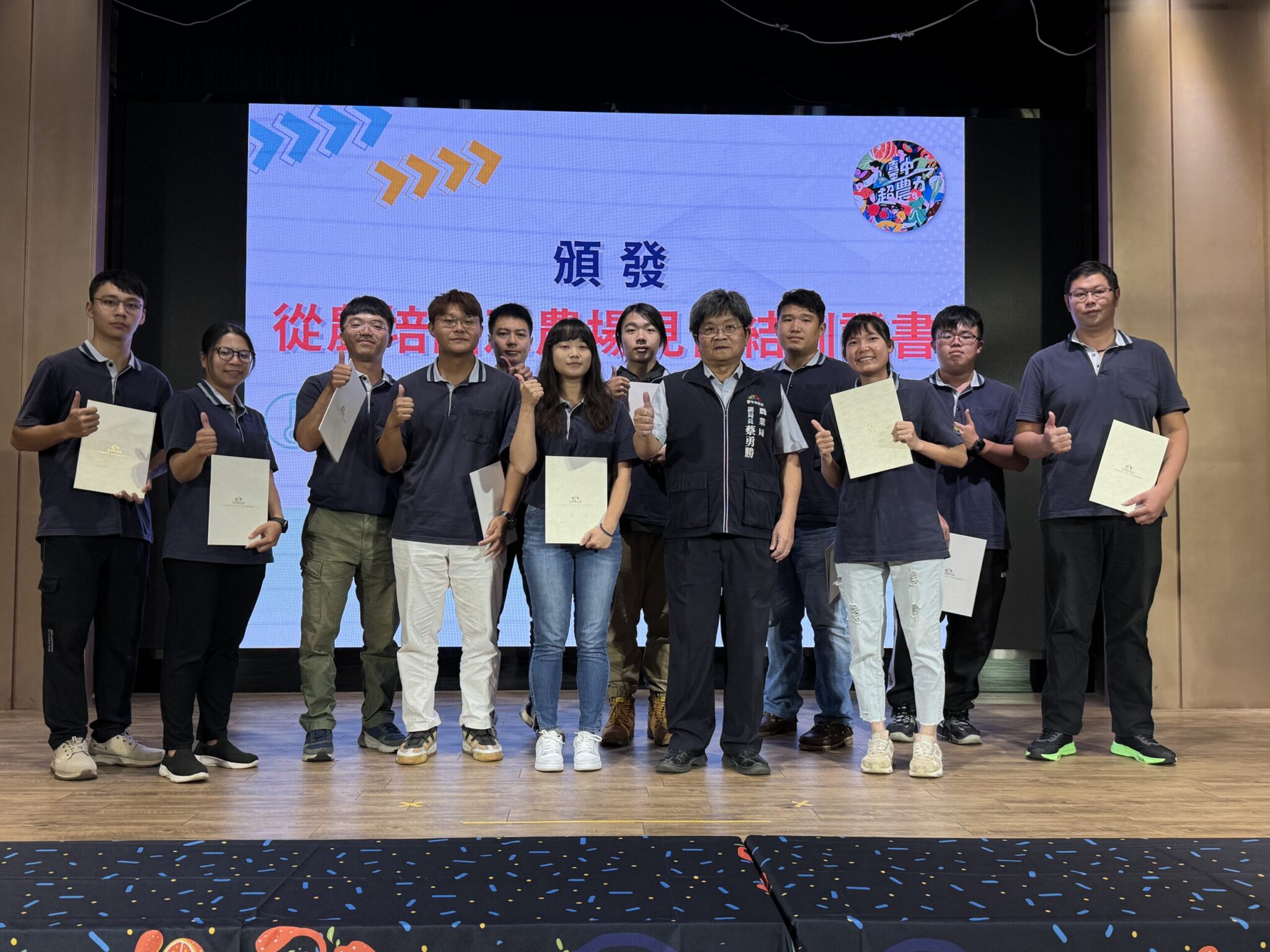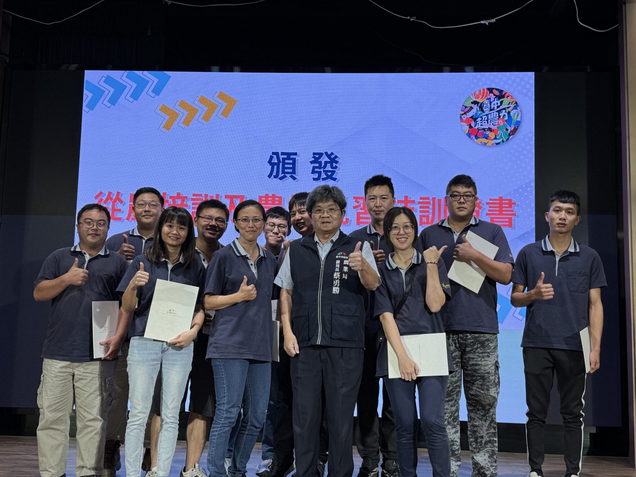 台中市政府農業局今(7)日辦理台中市青年農民輔導計畫-青年從農培訓結訓典禮,計有22位學員完成農業基礎課程及農場見習培訓,現場除頒發學員結訓證書外,還頒發12位農場主感謝狀,以感謝農場主提供場地並願意分享傳承栽培專業技術、經營模式予青農,同時期許青農將台中市的輔導方案與所學的專業技術分享出去,進而吸引更多青年朋友回鄉務農。