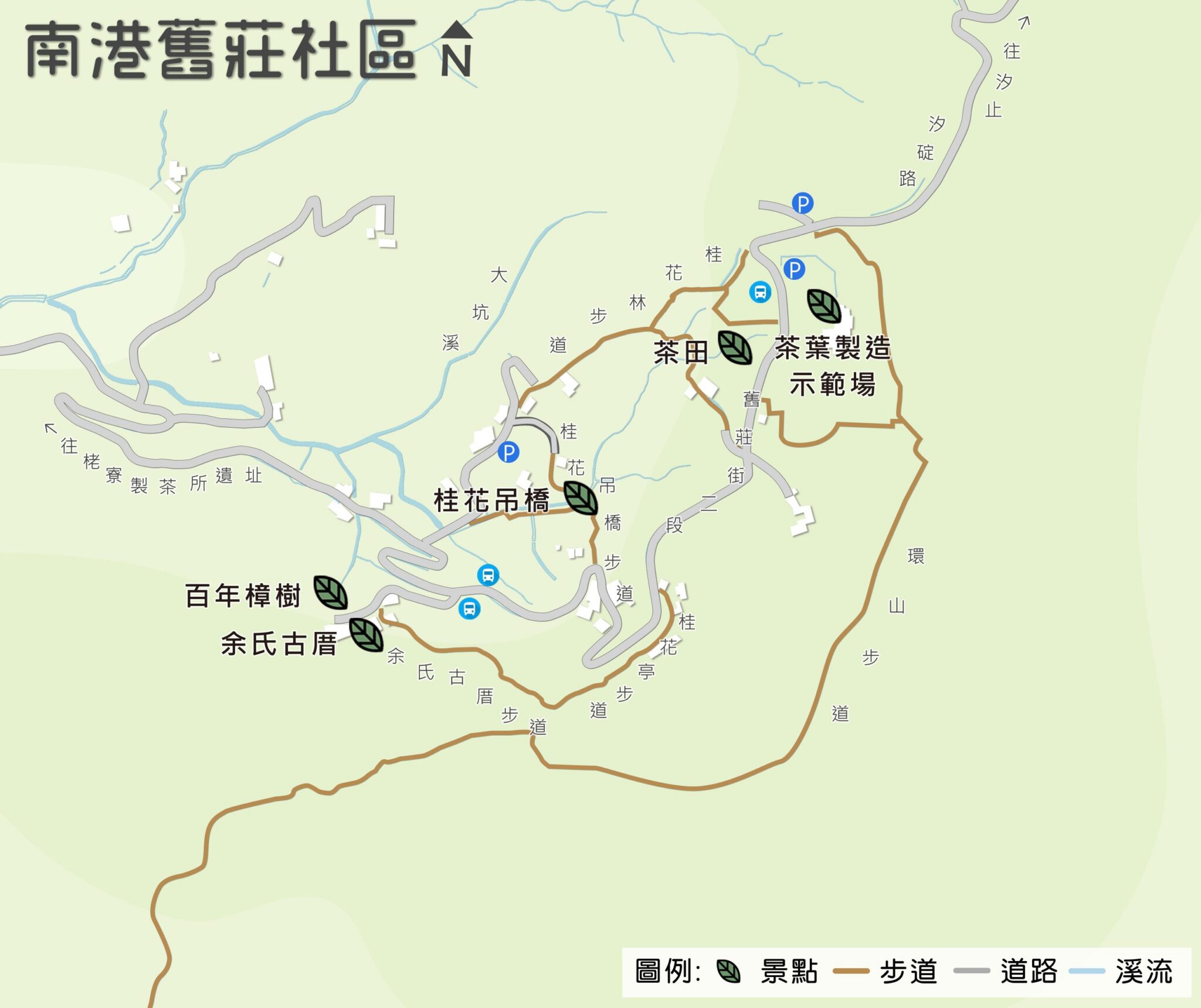 此外,除了茶葉與桂花,社區內還有多條步道散佈其中,每一條都有著自己獨特的魅力!建議可先從南港茶葉製造示範場參觀完後,沿著後方的步道步行,一邊感受山間樹林的清幽,一邊欣賞遠眺山巒的景色。