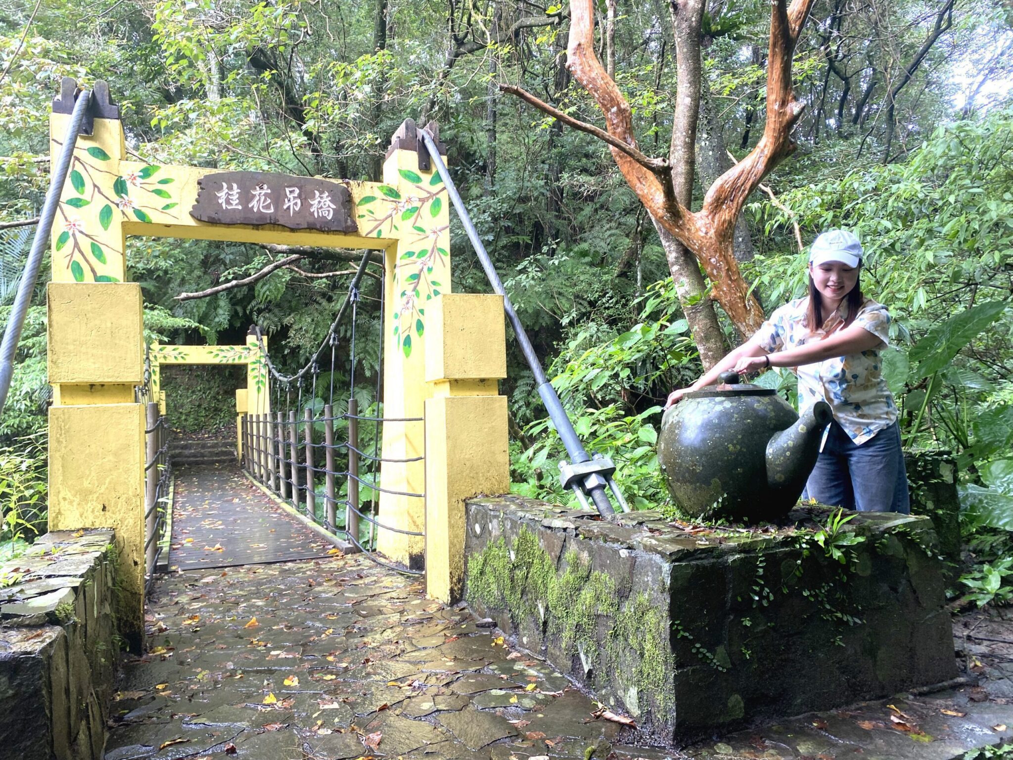 最後,在回程時一定要前往桂花吊橋步道,步道周邊有著許多桂花點綴於四周,通行之餘還會不時被桂花所散發出淡淡的香味給療癒。而在步徑中的桂花吊橋,是大家到此一遊必拍的地景,這處吊橋造型以桂花及茶壺作為意象設計樣貌,完整呈現了當地地標與特色。