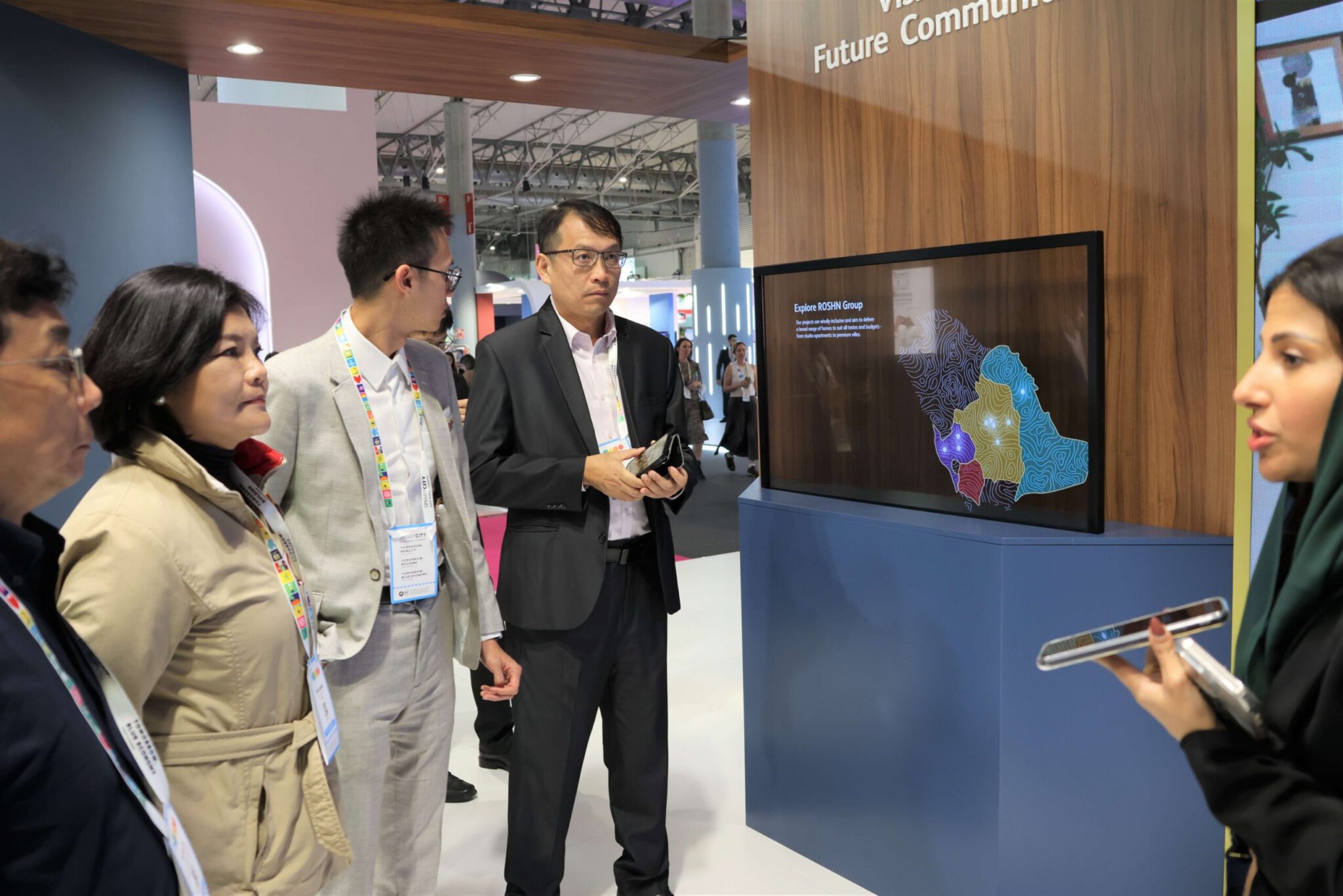 智慧城市展方特地為雲林縣府參訪團隊安排導覽,導覽的第一個展位為來自沙烏地阿拉伯的ROSHN公司,作為沙國「2030願景」的一部分,積極開發可持續發展的綜合社區,並融入智慧城市和綠色能源應用。ROSHN與地理資訊系統Esri的合作,為房地產開發中的地理空間技術應用提供支援,藉此提升沙國居民的生活品質。