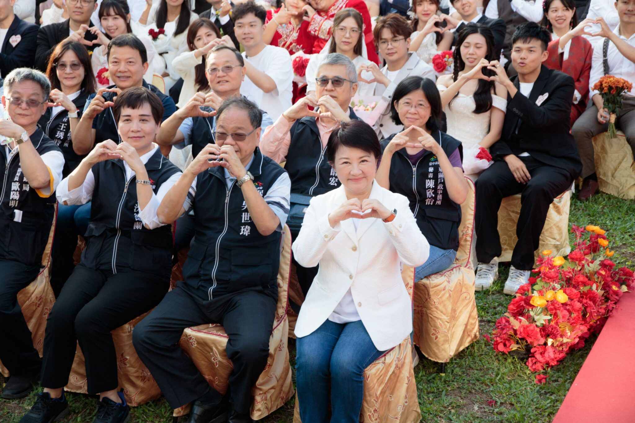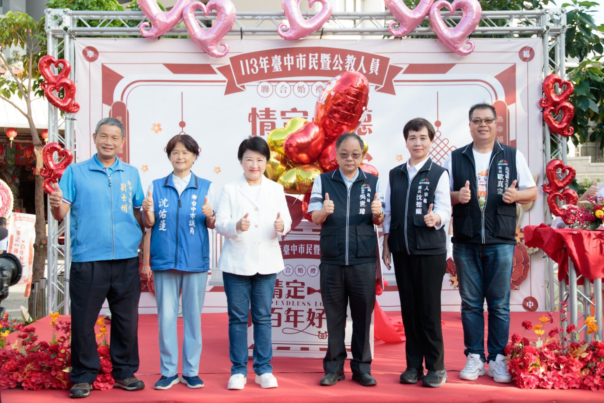 「113年台中市民暨公教人員聯合婚禮」今(10)日在北屯區歷史建築一德洋樓及一德公園浪漫登場,百對新人精心裝扮,搭乘復古黃包車繞行一德公園幸福進場,當紅歌手「鼓鼓」擔任婚禮幸福大使,與新人齊唱《當我變成我們》等婚禮主題曲,現場氣氛熱絡。市長盧秀燕以主婚人身分出席,帶領新人宣讀結婚宣言,祝福新人「情定一德、百年好合」。