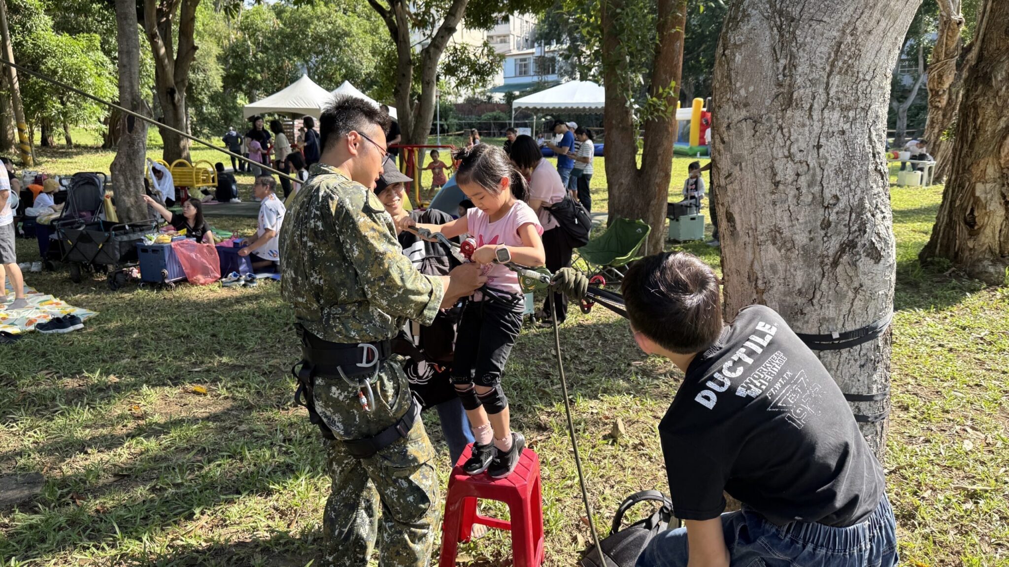 法制局說明,潭子區聚興社區休憩場域前身是新興營區,今年以此為特色設置了「降傘小兵活動區」,除了有降傘裝備,可讓市民朋友帥氣著裝打卡外,更設計了在大片草地上開傘奔跑活動,體驗乘風「飛奔」的感覺,現場民眾參與踴躍,直呼刺激好玩。同時也有氣球魔術表演、大型氣墊球池親子區及懷舊童玩世界闖關區等豐富活動。