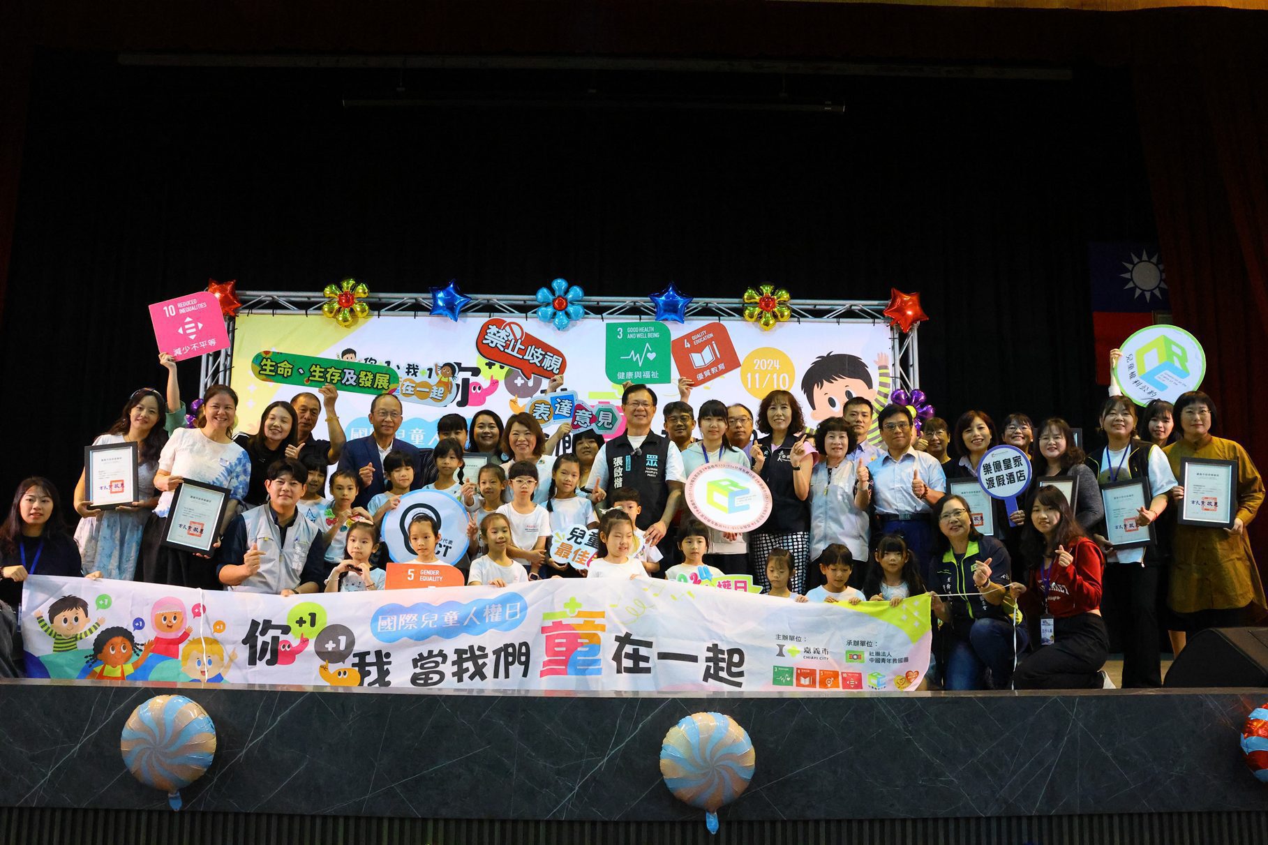 11月20日為「國際兒童人權日」前夕,嘉義市政府為呼籲大家「尊重兒童意見,關懷兒童未來」舉辦「當我們童在一起,共創兒童宜居城市」活動,邀請嘉義市兒少共同規劃活動內容,於昨(10)日在興嘉國小綜合體育館辦理113年度國際兒童人權日~「你+1、我+1,當我們童在一起」活動。嘉義市長黃敏惠與兒少代表齊呼籲響應兒童權利公約,使用流沙填滿活動的主題「你+1、我+1 當我們童在一起」,宣誓守護兒童身心健康發展決心、共創良善的環境。