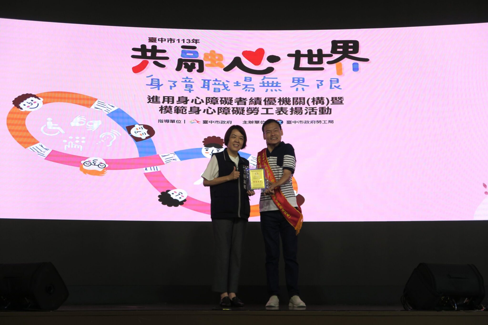 為鼓勵身心障礙者投入職場、突破限制,並嘉勉企業積極進用身心障礙者,台中市政府於今(15)日舉行「113年進用身心障礙者績優機關(構)暨模範身心障礙勞工表揚大會」,由勞工局長林淑媛頒獎表揚10位模範身障勞工、12家優良單位,以及公益採購及職場體驗友善廠商,感謝社會各界為身障者所做的努力。