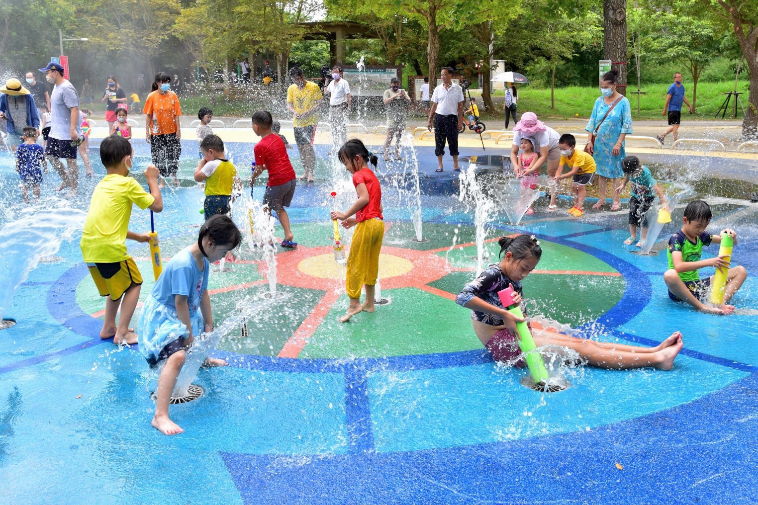 觀旅局表示,戲水區內有水霧水幕噴水設施、隧道噴泉、火山噴泉、葉子噴柱及2座噴水槍等戲水設施,一旁也貼心設置驛站供民眾更衣淋浴,大幅提升親子使用的安全及舒適性,這些精彩的設施既能讓小朋友玩得開心,也為大人們提供一處避暑放鬆的好地方。