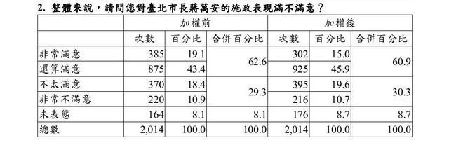 關於蔣萬安的施政表現滿意度,調查結果顯示,滿意度60.9%、不滿意度30.3%,呈現滿意遠高於不滿意的趨勢。