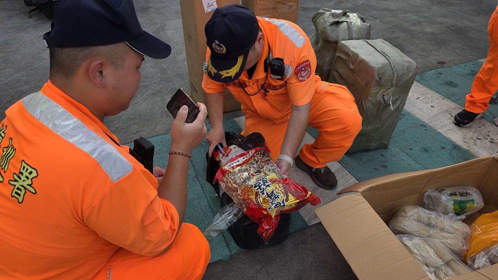 海巡人員於現場埋伏守候,待收貨人完成提領並裝車後,即實施攔查與拆檢作業。經現場運用偵搜犬與手持式背散射X光機進行檢測,當場查獲一批外包裝及標示均為簡體字樣的中國大陸製產品。經初步清點,貨品包含:大麥青汁粉、藥品、糖果、螺螄粉酸筍螺肉醬、火鍋牛油及香菇等項目,合計6類350餘公斤。海巡署已完成貨品查扣及相關採樣程序,後續將依違反《試辦金門馬祖澎湖與大陸地區通航實施辦法》及《海關緝私條例》等相關規定,函送主管機關裁處。