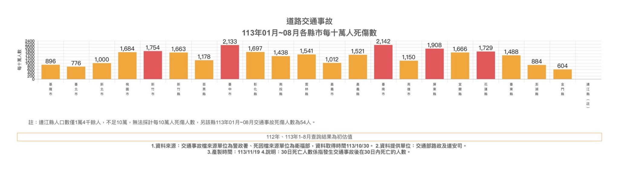 針對基隆市議會議員質詢中提及之行人死傷數據,基隆市政府發言人呂謦煒澄清,根據交通部「道安總動員」網站數據,113年1-8月全台各縣市道路交通安全事故每十萬人死傷數,基隆市為每十萬人896人,在台灣本島各縣市中,僅次於台北市的776人,死傷數字是全台第二低,象徵基隆「行人友善」政策有成,成效全台第二好,並將持續邁向比肩台北的方向努力,議員質詢中提及之內容應有誤解。