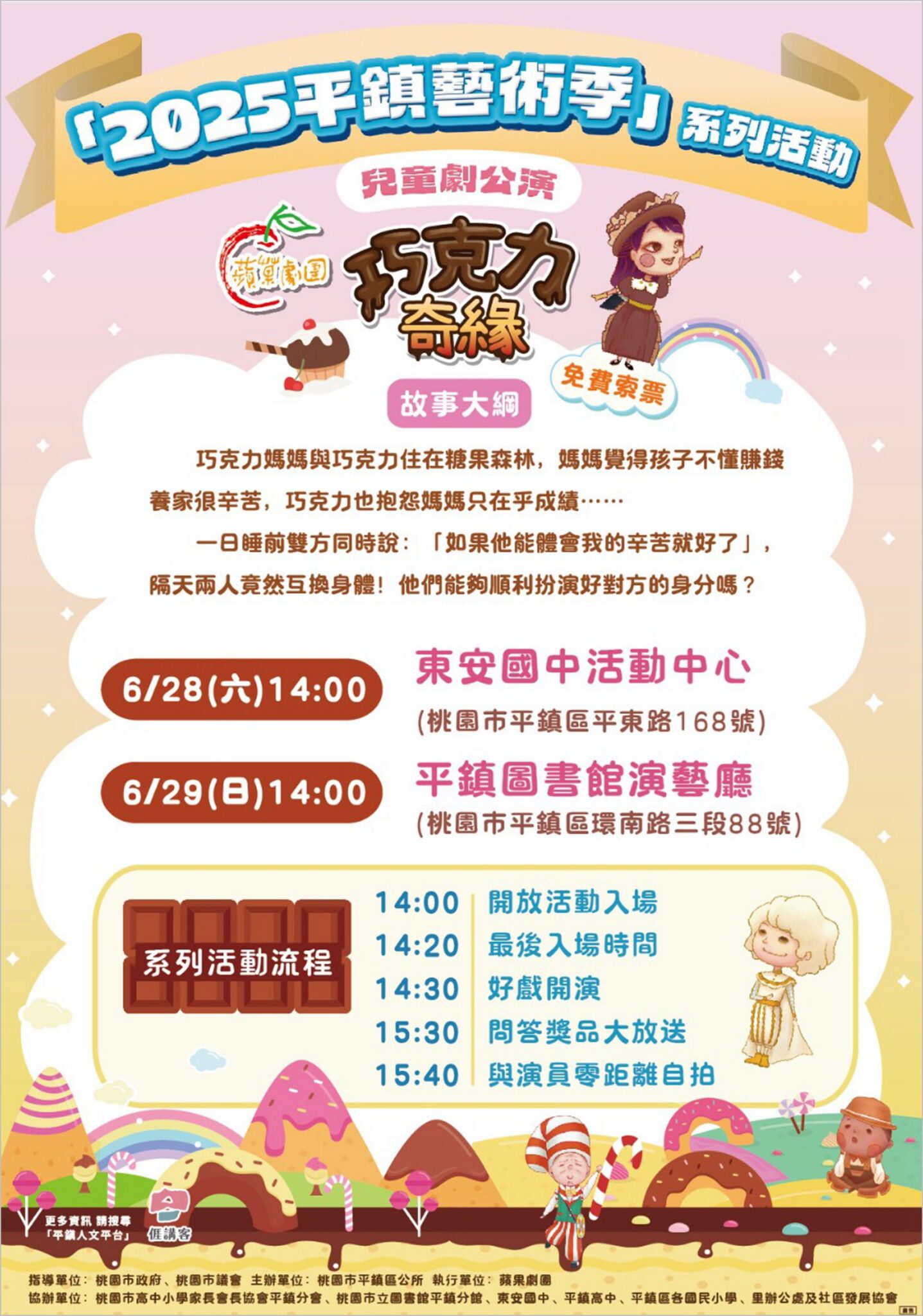 平鎮區今年度首次嘗試將藝術季與校園巡演結合,巡迴全區13所國小進行兒童劇短演,吸引近5,000名在校師生熱情參與,小朋友們看得目不轉睛,大朋友們也樂在其中,現場笑聲此起彼落。此外,2場次的大型公演,預計分別在平鎮區東安國中及平鎮圖書館演藝廳舉辦,以更大規模呈現精彩的演出「巧克力奇緣」,以身體互換的奇幻旅程,結合魔術出奇不意的渲染力,帶領家長與孩子瞭解彼此內心的聲音,學習換位思考尊重他人,促進親子溝通與體諒。