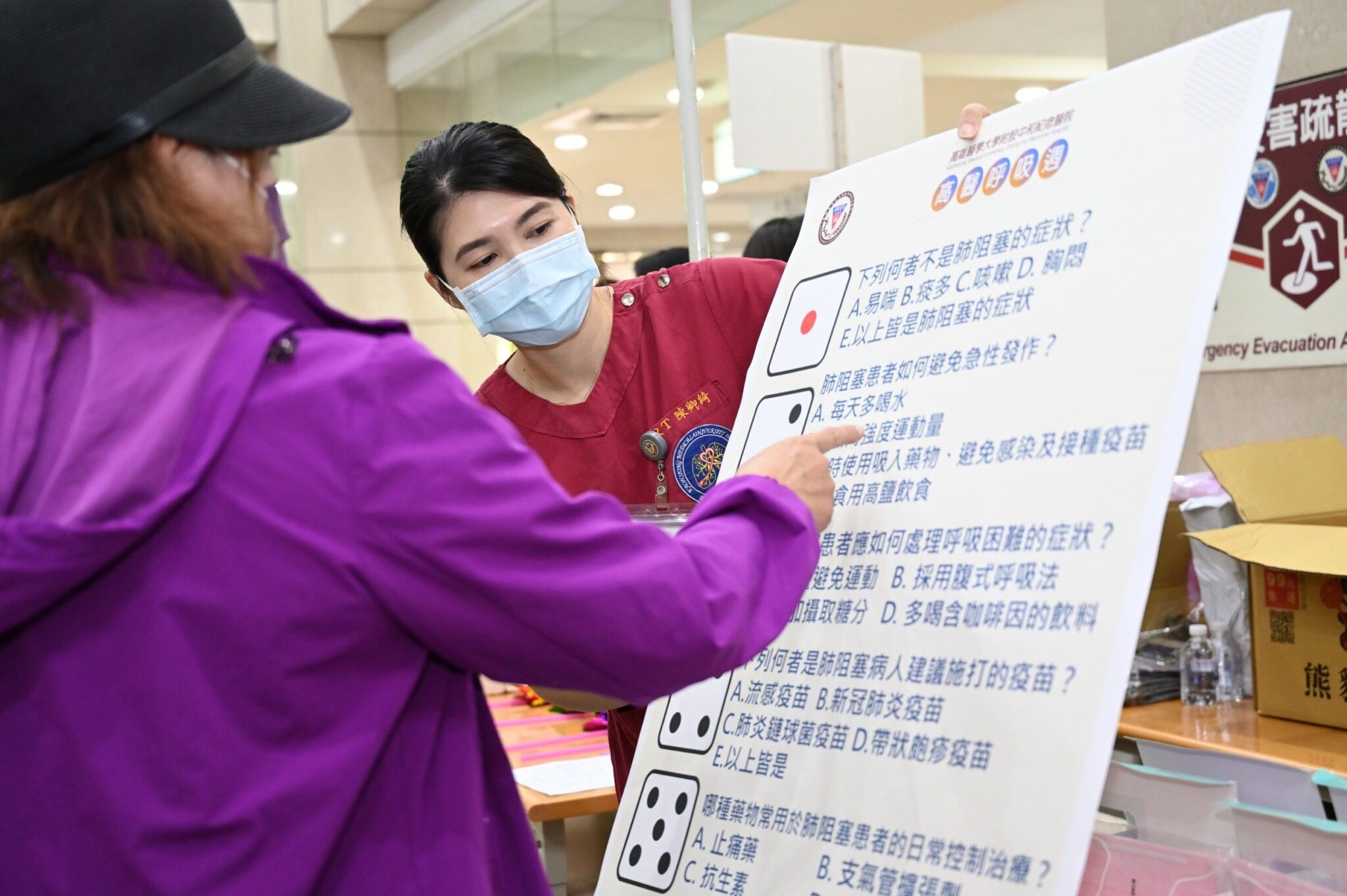 「健康呼吸,樂享生活」宣導活動現場,除了安排胸腔科醫師專題演講外,並設置許多小活動與民眾互動,包含:一口氣旋風挑戰(肺活量競賽)、認識你的呼吸力(COPD篩檢)、呼吸健康知識王(衛教及預防保健)、雙輪手搖探險(肺復原體驗),以及現場的肺功能篩檢、肺部疾病醫療諮詢、疫苗注射諮詢、營養篩檢諮詢專區,帶領民眾對氣喘及慢性呼吸道疾病的治療和預防能有更深的認識。