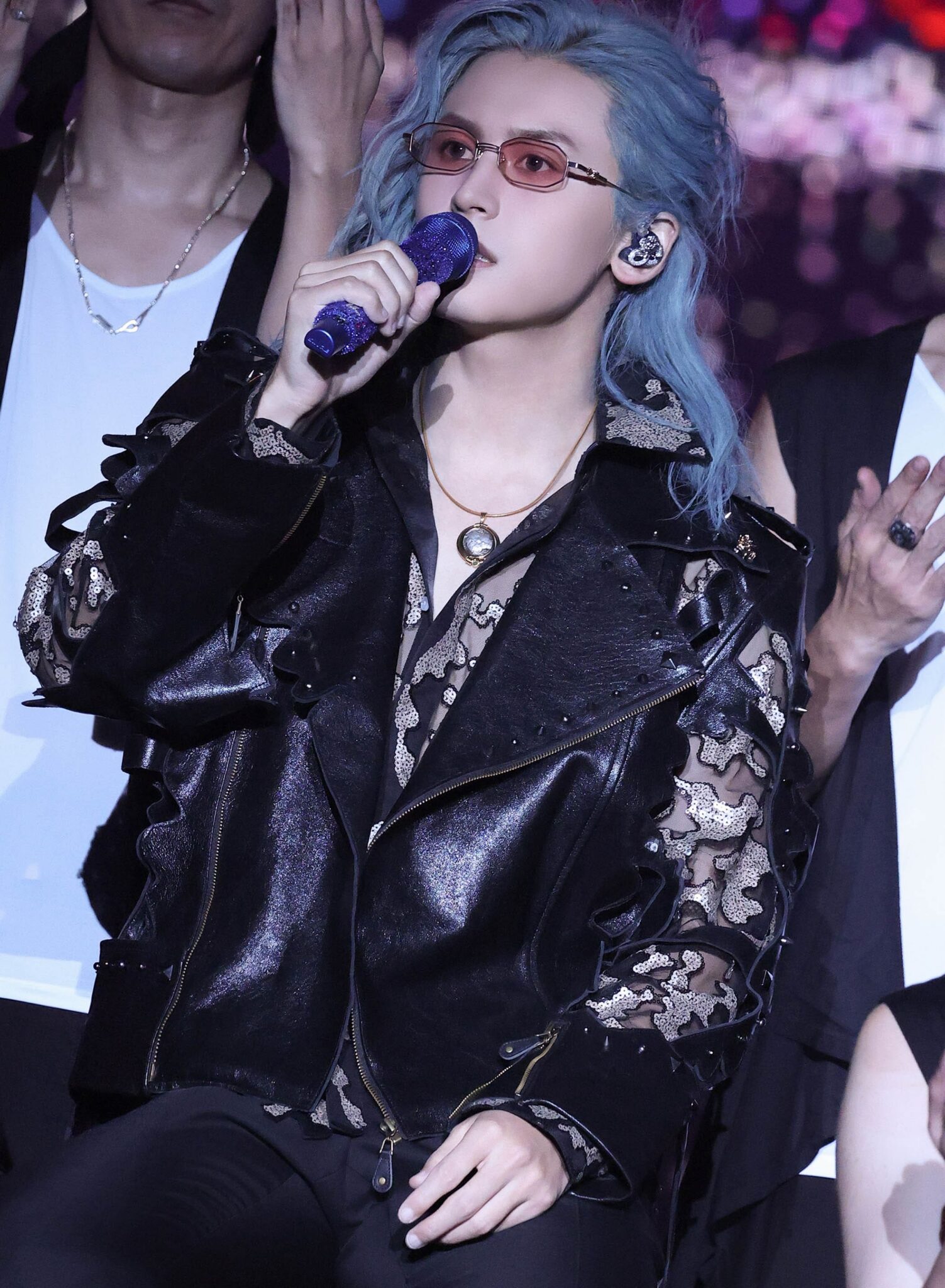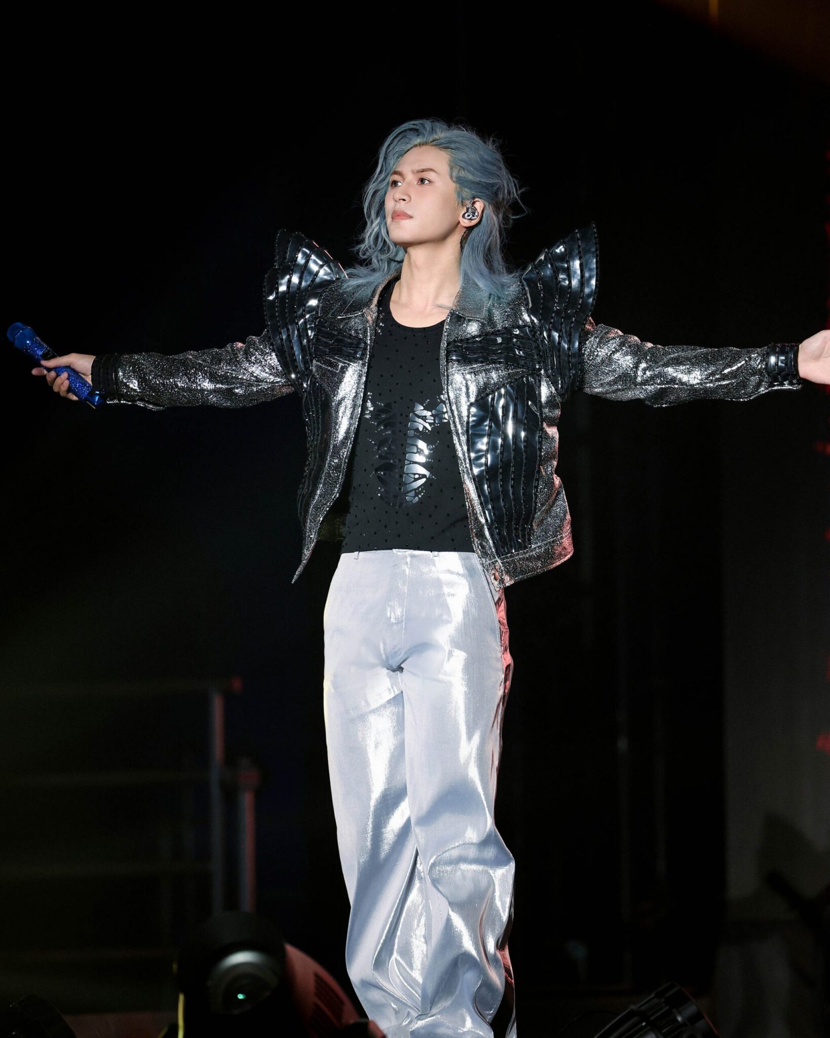 張哲瀚《洪荒劇場2.0》演唱會,除了全新編排的舞曲及多首新歌首唱外,舞臺設計與服裝造型全面升級。其中,在演唱〈無題〉時,他身著EHz· Z特別定製款藍色套裝,披戴翅膀造型亮相,服飾的垂墜質感搭配歌手冰藍髮色體現有如「水」般的輕盈靈動,藍色漸變半透明翅膀,則在材質上別出心裁地採用固態材質,呈現有如「石」般的堅韌沉靜,達到剛柔並濟的韻味。翅膀在燈光映照下熠熠生輝,張哲瀚在舞臺宛若身披羽翼的騎士,無拘隨音樂穿過雲層和天地,附著一抹神秘夢幻的自由色彩。