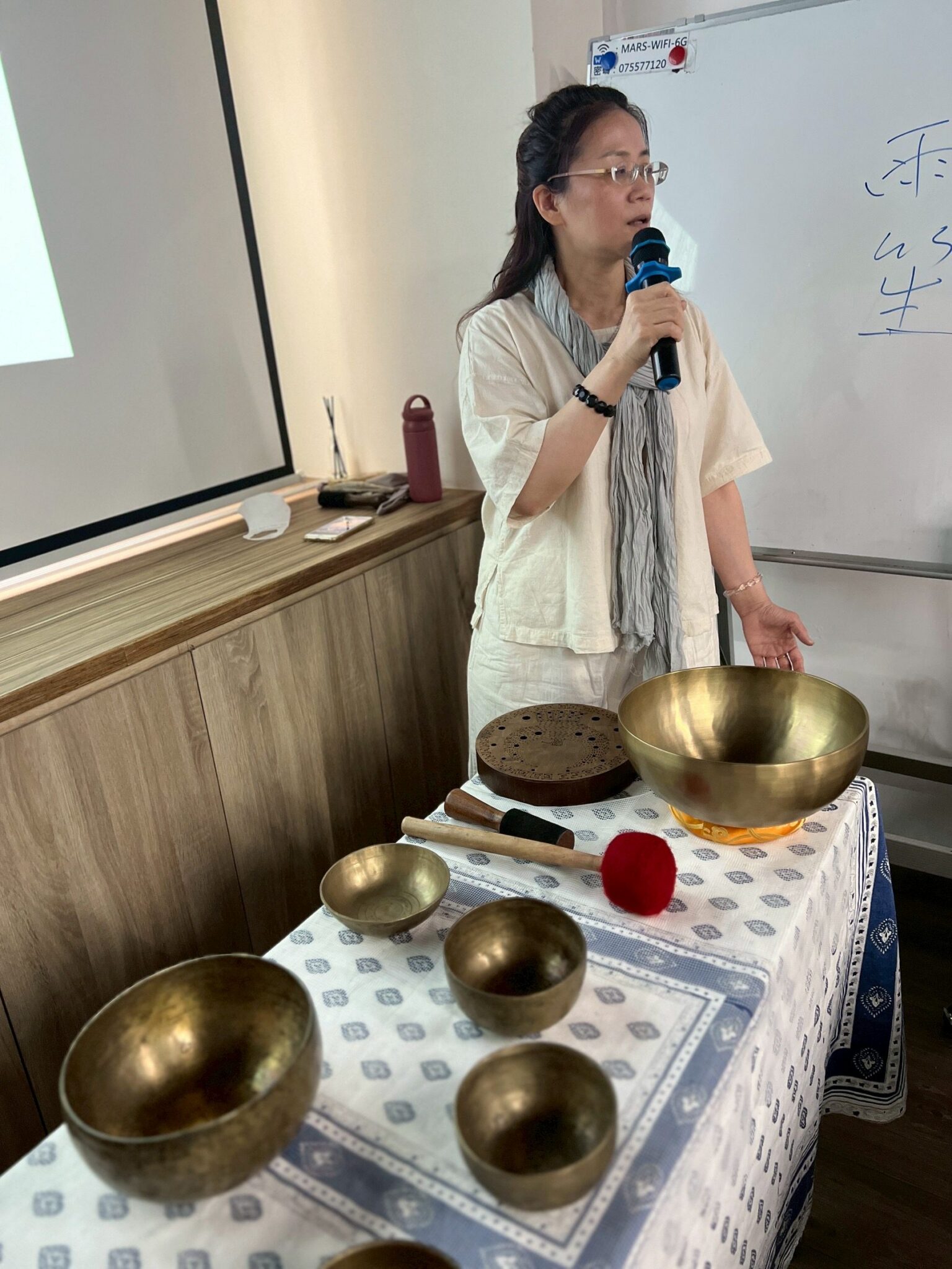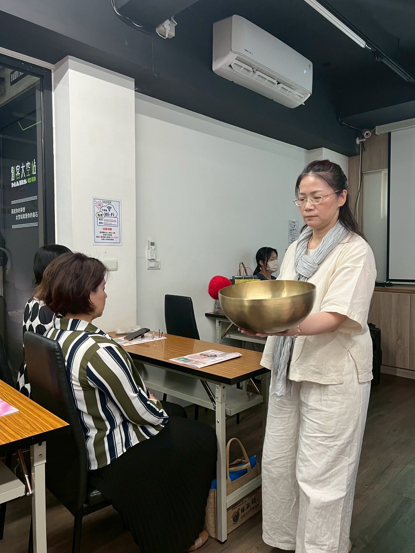 現場參與者在頌缽清澈悠長的泛音中緩緩閉上雙眼,透過聲波共振讓身心達到深度放鬆。王老師也簡要說明頌缽的起源、作用機制與適用對象,強調「頌缽是一種與自己對話的橋樑,不是替代醫療,而是支持修復、觸動內在的聲音。」