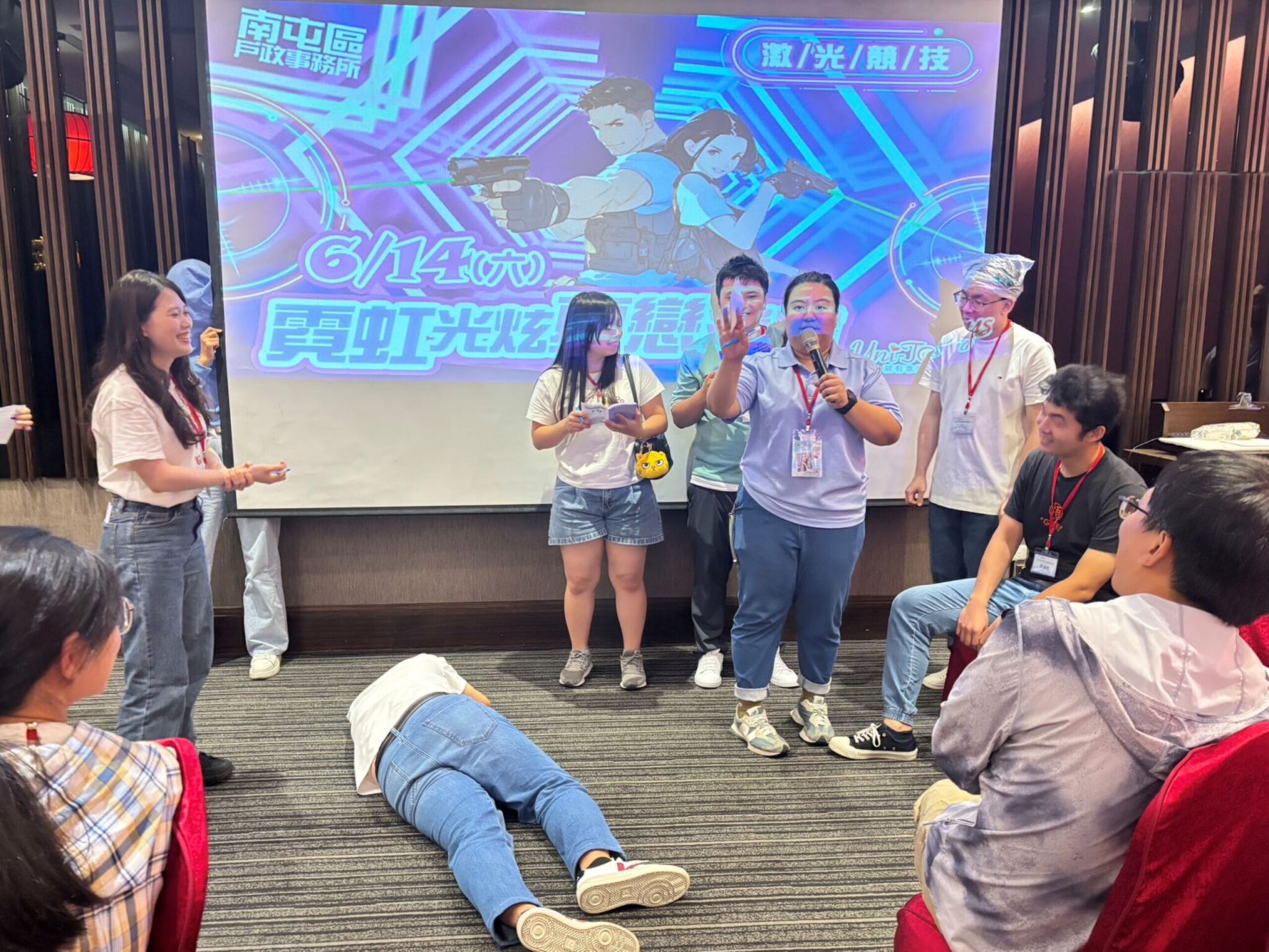 南屯戶所主任林峰輝表示,此次活動特別設計「光彈派對戀習三部曲」,巧妙結合鐳射競技與K歌互動,讓參與者在動靜交錯的過程中逐步建立默契。參加者一早前往「六度空間台中分店」展開鐳射光戰,大家身穿專業裝備、穿梭於障礙場景之間,透過團隊合作與戰術分工激發默契,拉近彼此距離。競賽後,則前往「女兒紅婚宴會館」共享午餐時光,並挑戰K歌環節,從深情對唱、默契遊戲到真情告白,甜蜜氛圍不斷升溫,為這場充滿驚喜與悸動的夏日戀習畫下浪漫句點。