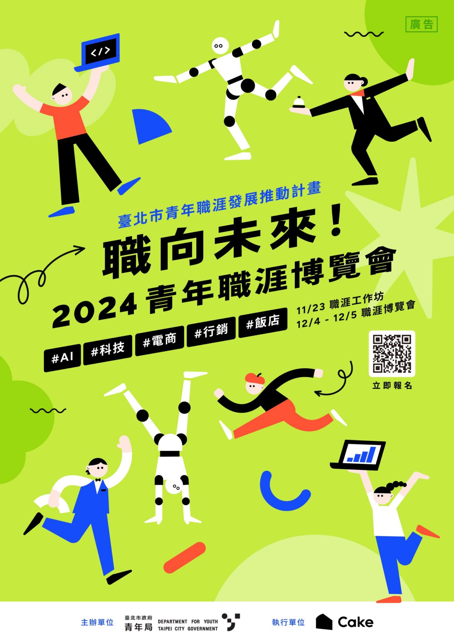 為強化青年職前準備、創造青年實習與就業機會,臺北市政府青年局與國際人才社群Cake合作於12/4(三)、12/5(四)在青年局1樓大廳舉辦「職向未來!青年職涯博覽會」,將聚焦「電商&旅遊」、「AI 科技&軟體網路」兩大主題之人才媒合活動,攜手電商、旅宿及科技業者釋出超過千名職缺,盼青年搭上年後求職轉職熱潮,企業得才所用共創雙贏。