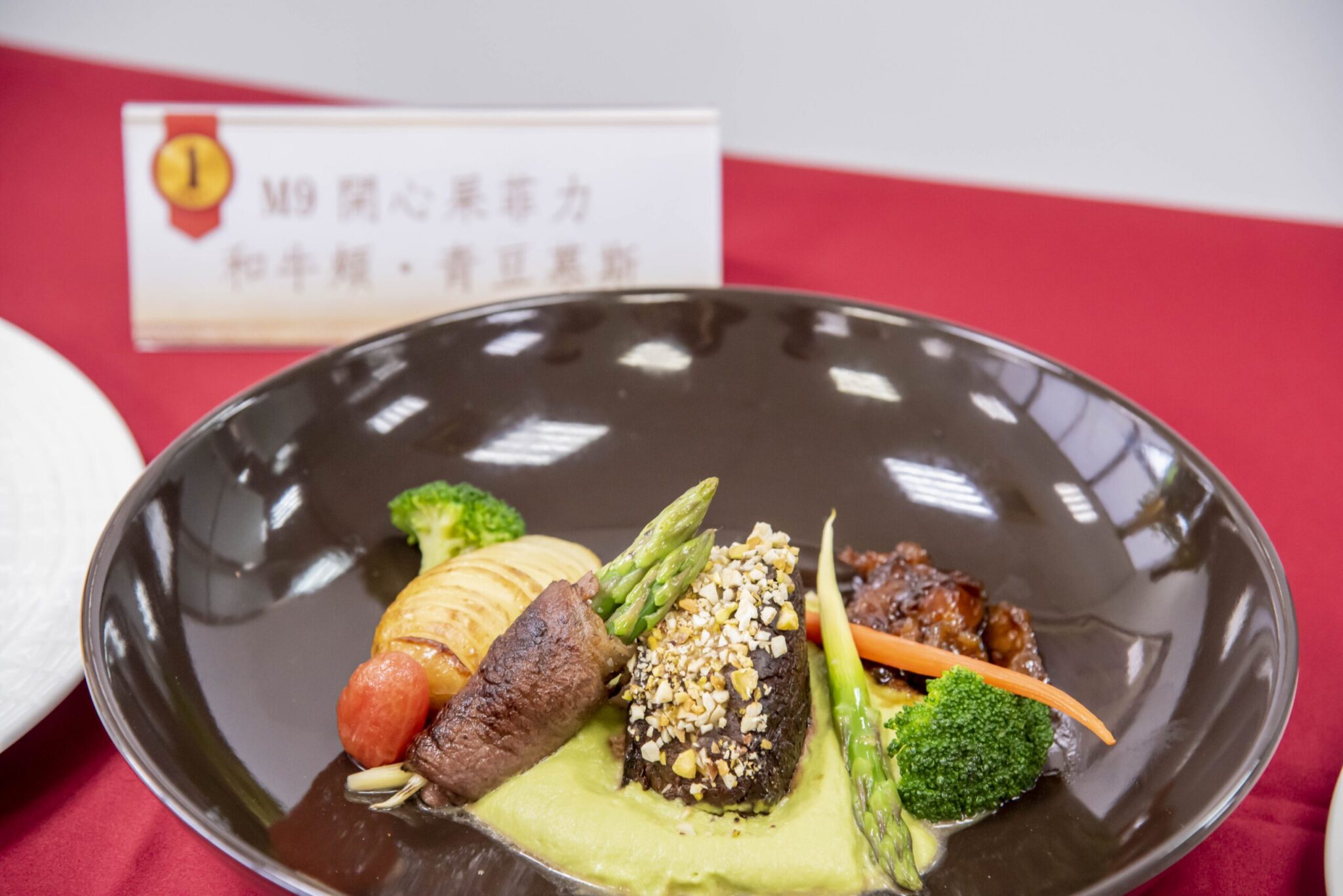 獲得開胃菜金牌的作品是結合台南將軍烏魚子、東港黑鮪魚上腹、山葵及特調焙煎芝麻,打造台灣味十足的創意料理,精湛技藝獲評審一致肯定。
