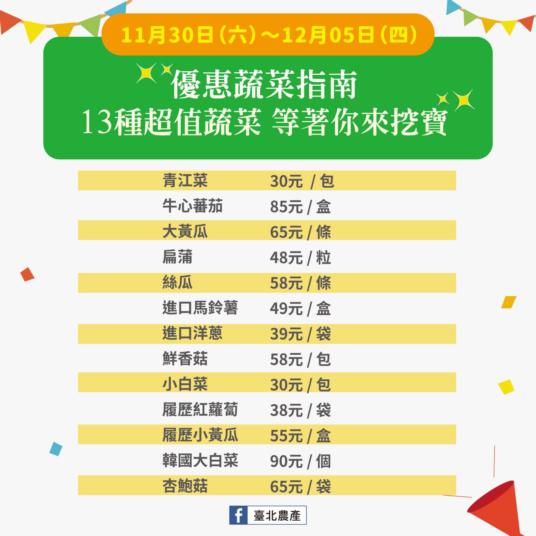 這次的平價蔬菜優惠期間,自今(11月30)日至 12月5日共6天,歡迎消費者前往選購。