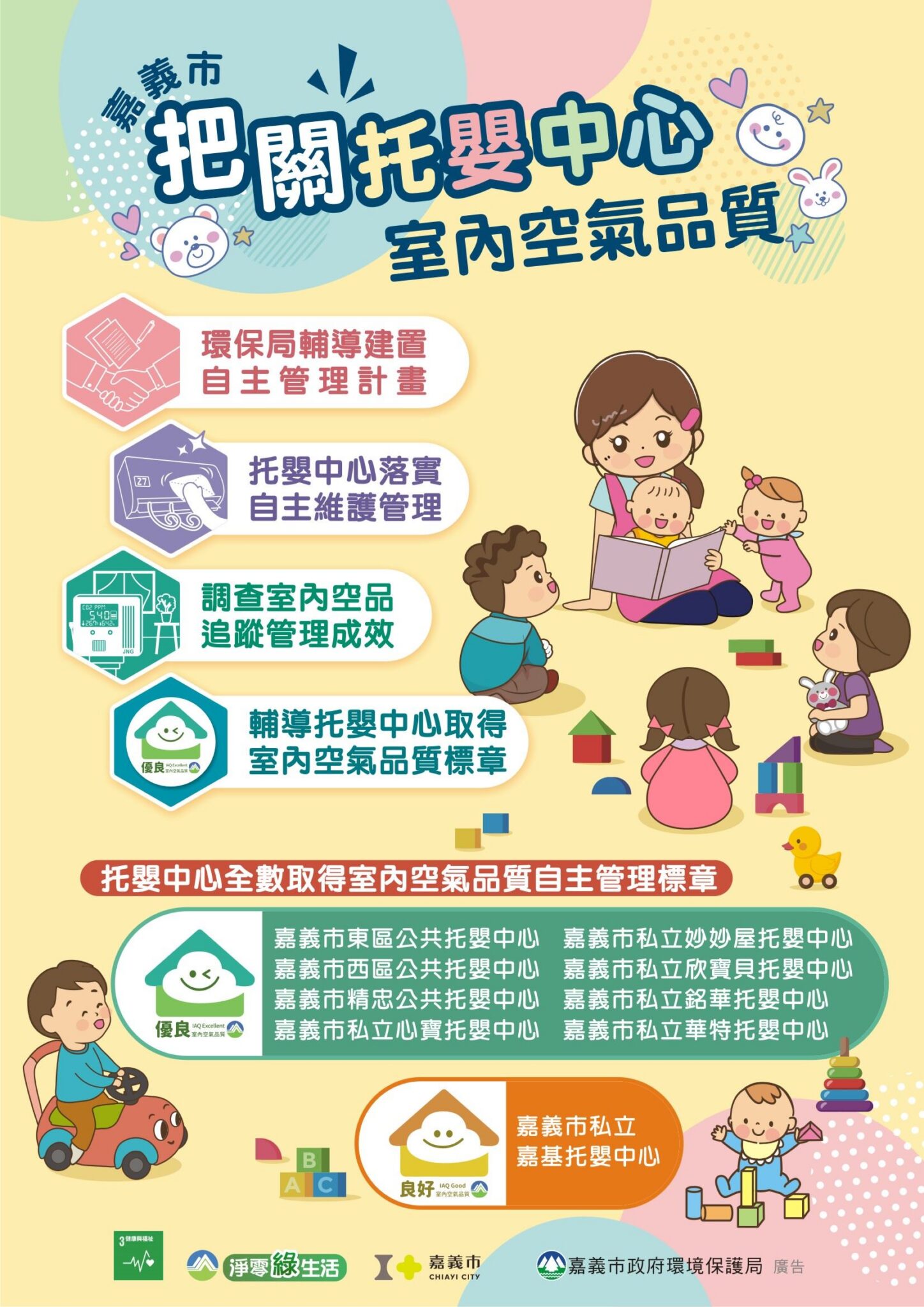 為維護敏弱族群健康,嘉義市政府環境保護局對於轄內托嬰中心、幼兒園、產後護理機構及社福機構等非公告列管場所持續輔導其營造良好的室內空氣品質環境,今(113)年完成輔導轄內托嬰中心全數取得室內空氣品質自主管理標章,讓托育於場所之嬰幼兒使用更健康安心的室內環境。