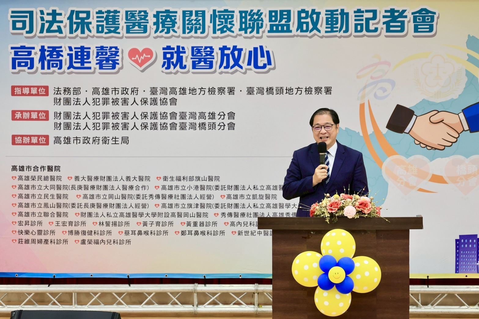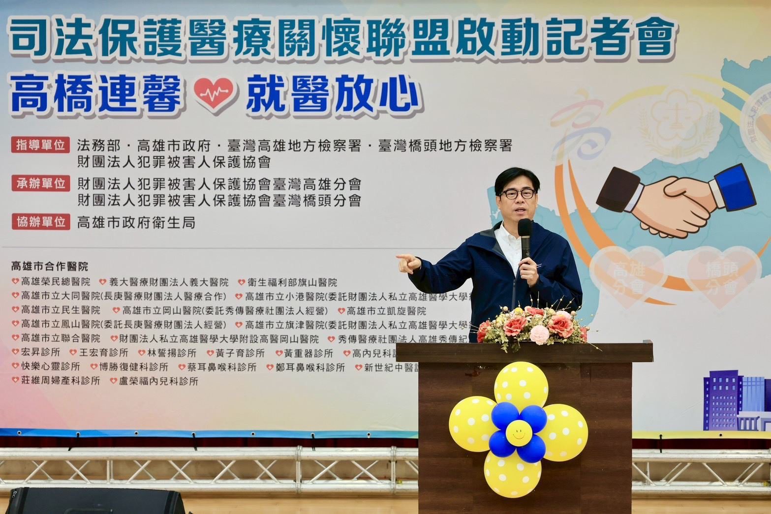 為保障犯罪被害人就醫權益,高雄市政府與財團法人犯罪被害人保護協會臺灣高雄分會與臺灣橋頭分會,聯合高雄多家公私立醫療院所,推動司法與醫療跨域合作聯盟,提供犯罪被害人就醫免除掛號費的補助措施。高雄市市長陳其邁今(20)日與法務部部長鄭銘謙及犯保協會共同出席啟動記者會,期能健全擴大醫療服務網,讓犯罪被害人受到最好的照顧。