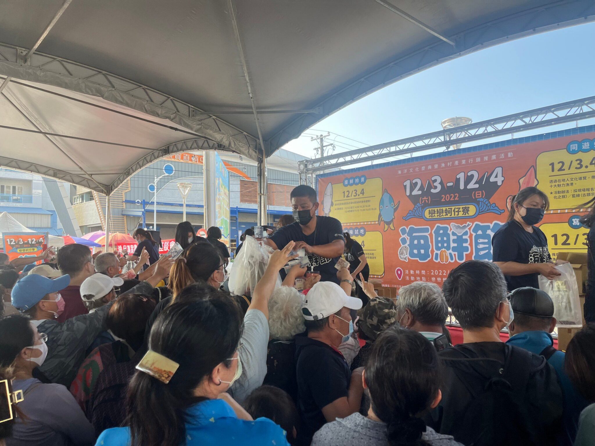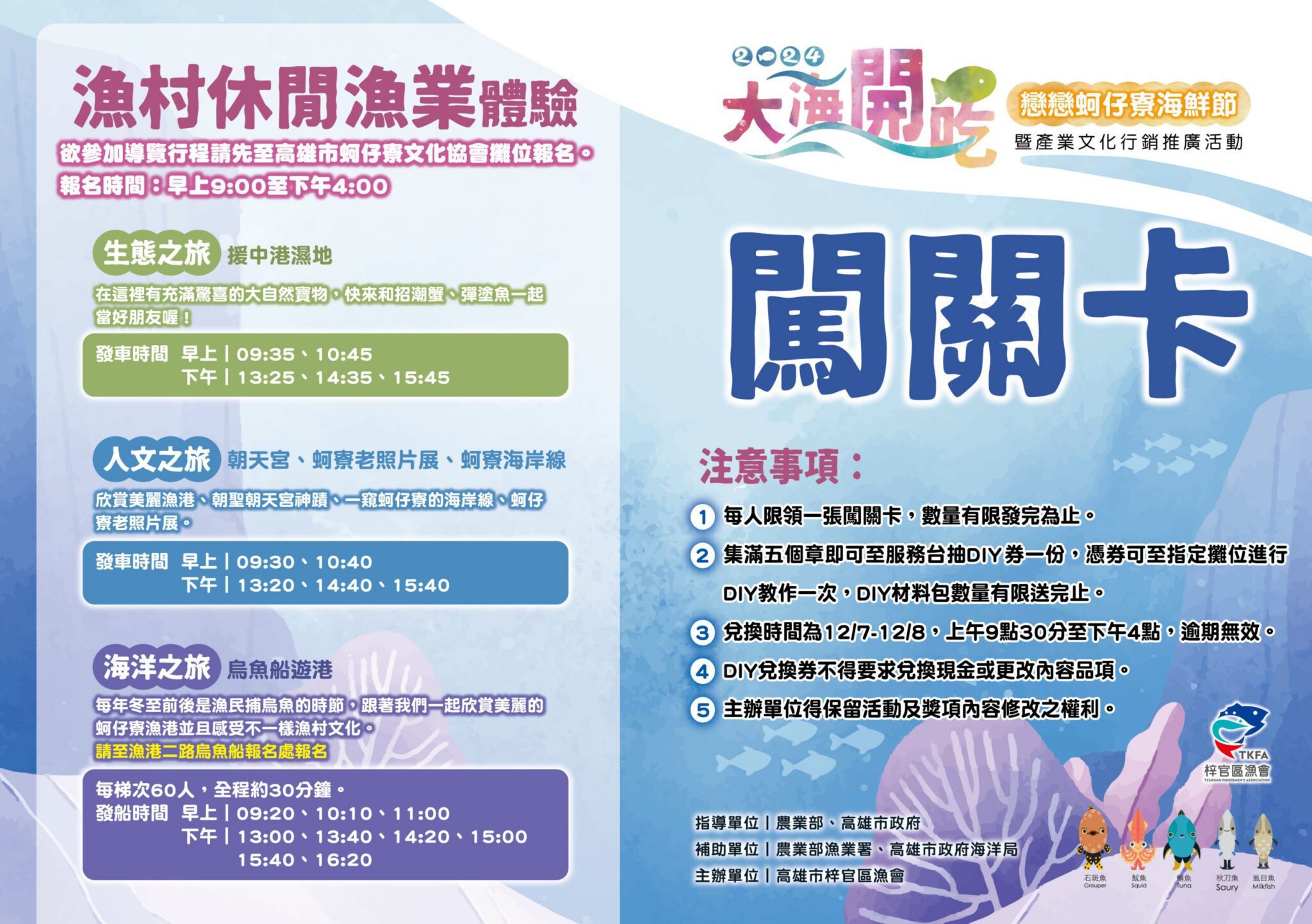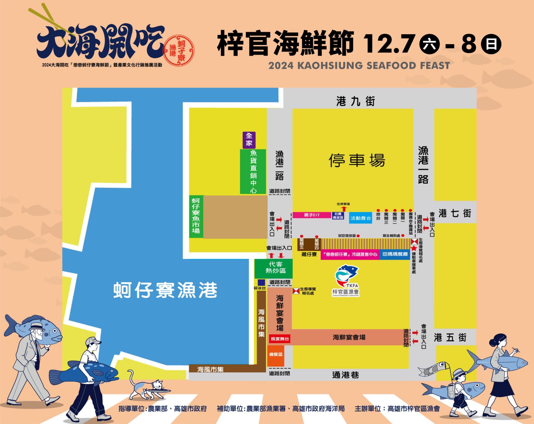 2024大海開吃系列活動壓軸場次-梓官海鮮節,12月7日至8日於蚵子寮漁港登場,現場有「糶手搶拍」魚貨拍賣、「漫遊蚵子寮」漁村小旅行、「海嗨蚵寮」親子闖關DIY、海洋市集等活動,以及每日提供烏魚子、烏魚米粉、休閒食品等漁產品免費品嚐,讓大家能夠有吃又有拿,滿載而歸。