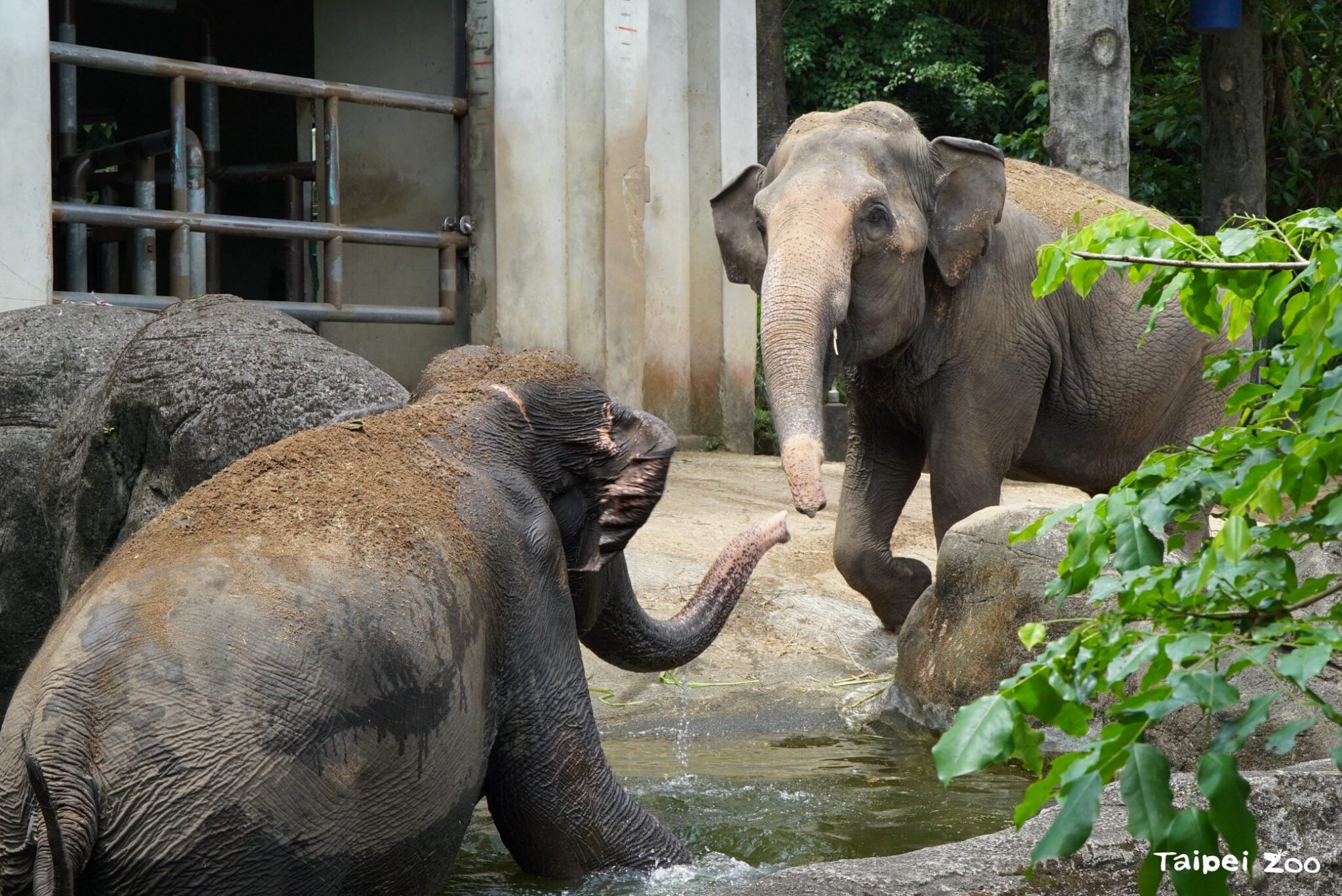 熱帶雨林區的亞洲象「友信」和「友愷」最近經常到水池中玩水,甚至側躺全身潛入水中,連潛水專用的「呼吸管」象鼻也一起泡在水中!和遊客平常會看到亞洲象在陸上玩耍的形象大不相同。亞洲象們在戲水的同時,除了會用鼻子接瀑布的水來喝或用瀑布水流沖背當起「SPA水療」,趴在水池裡時也不忘用鼻子一把捲起池邊的植物當點心吃,泡完水後還會熟練地把沙土灑到背上防曬。