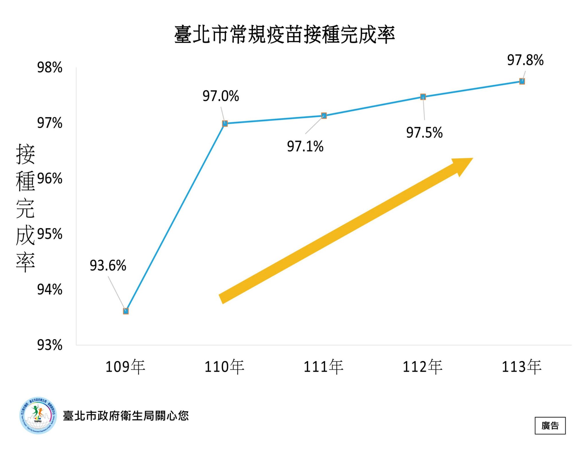 疫苗接種能夠減少傳染病發生,降低重症及死亡的風險,是全球公認最成功的傳染病防治措施之一。臺北市6歲幼童公費常規疫苗完成率逐年增加,已由109年的93.6%提升至113年的97.8%,臺北市政府衛生局呼籲家長應依「預防接種時程及紀錄表」,按時帶幼兒及滿5歲至國小入學前兒童前往接種疫苗,守護健康。