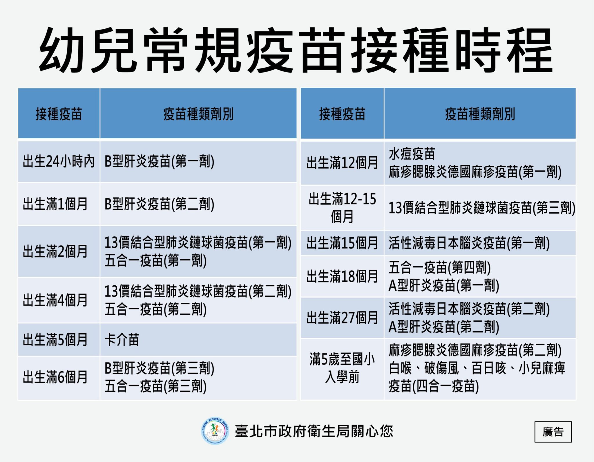 北市衛生局說明,目前公費兒童常規疫苗共9種19劑,其中幼兒在出生至3歲期間需完成8種疫 苗共17劑接種,5歲至入學前應接種「麻疹、腮腺炎、德國麻疹疫苗(MMR)第2劑」及「白喉、破傷風、非細胞性百日咳及不活化小兒麻痺混合疫苗(四合一)1劑」等2劑疫苗,並於開學時繳交「預防接種時程及紀錄表」影本,以利學校查核。