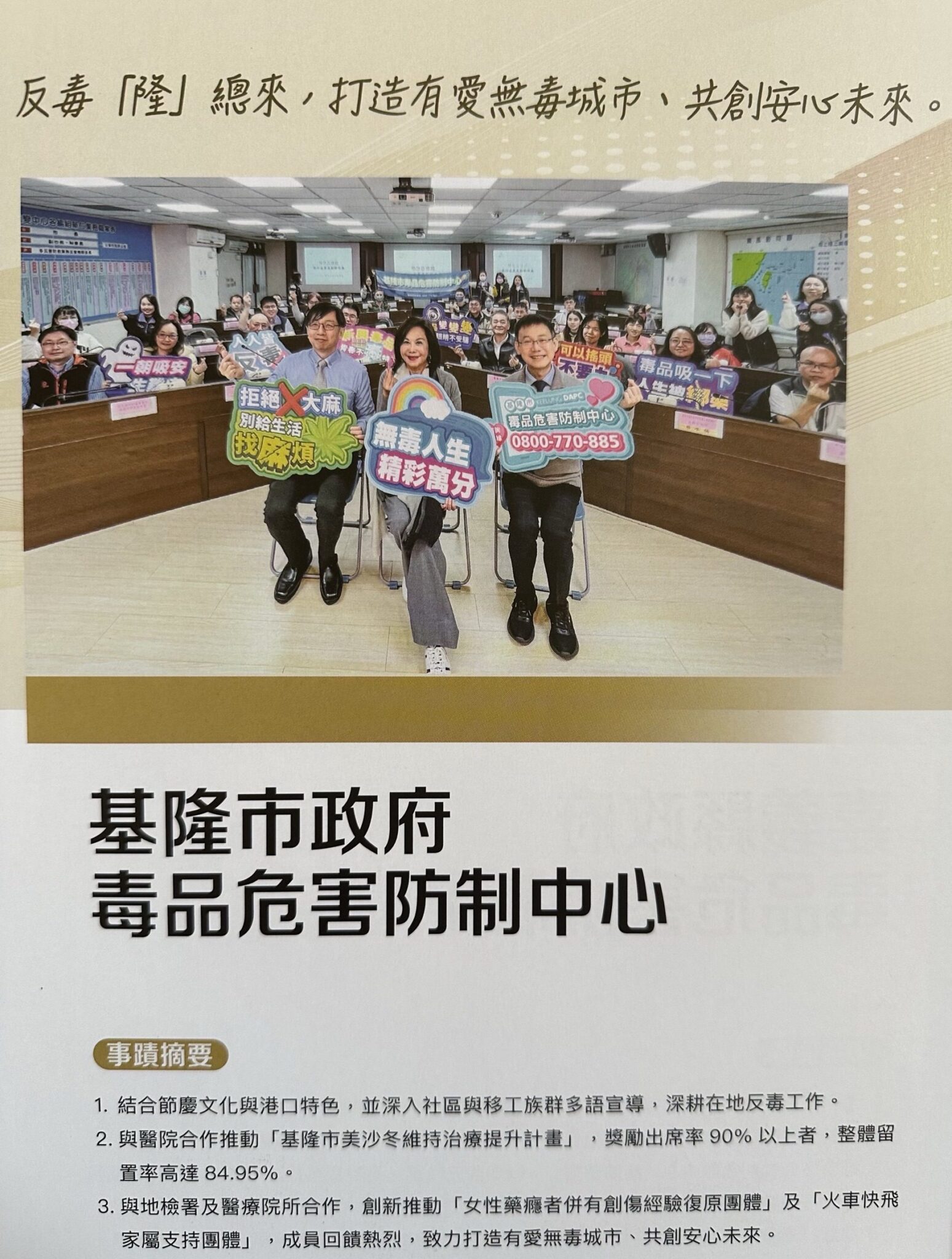 基隆市毒品危害防制中心以「有愛無毒、共創安心未來」為目標,結合公私部門跨局處團隊攜手合作,推動多元共管服務,整合衛政、社政、教育、警政及醫療機構,設立兒童青少年心理健康門診。依據本市藥癮個案特性與需求,發展整合式藥癮處遇計畫與宣導模式,使本市維持治療留置率高達85%,極為不易。