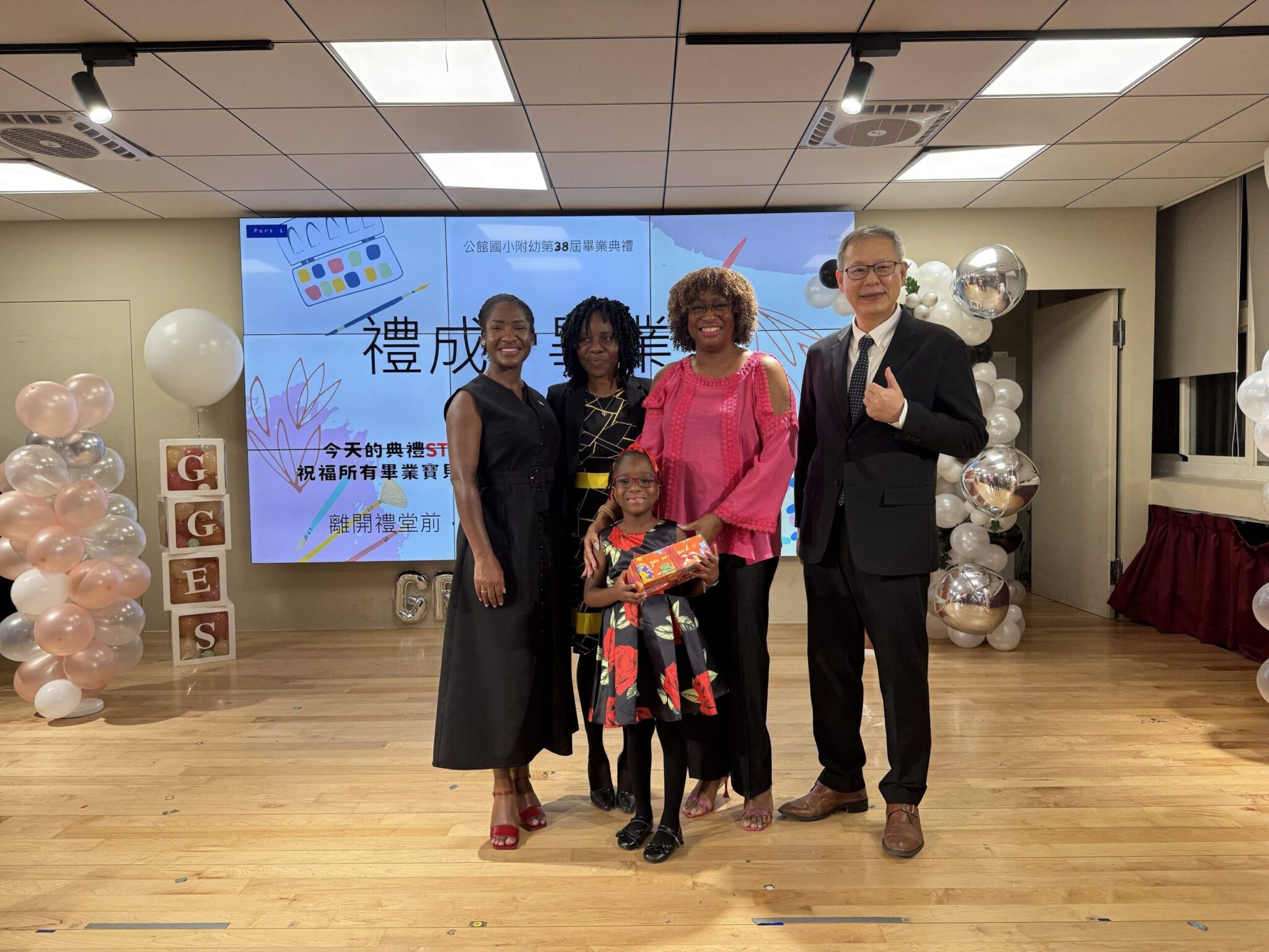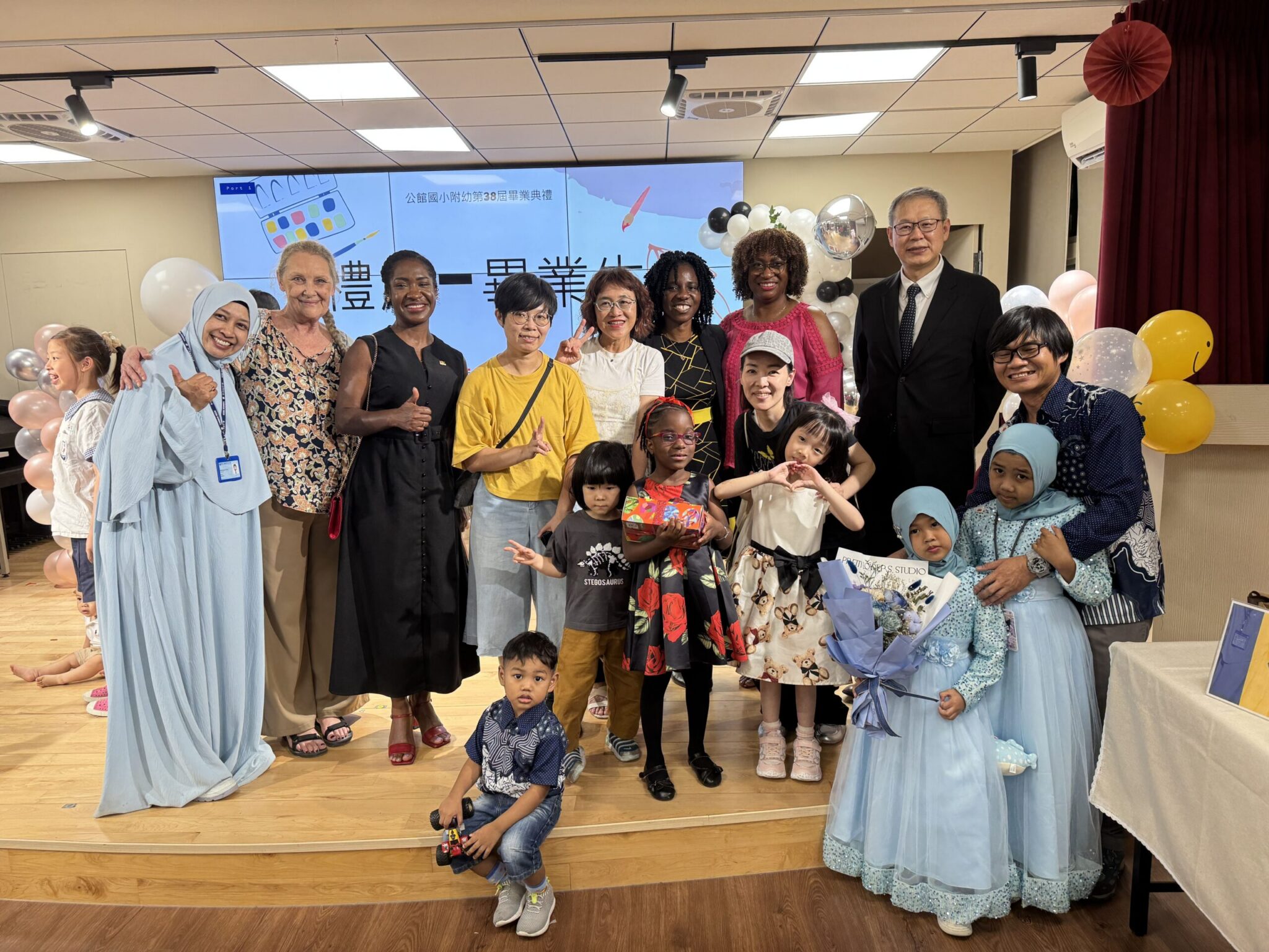 在幼兒園畢業生中,有一位孩子來自聖文森國。我國與聖文森國邦交超過40年,這40年來,兩國在外交、教育及文化上,交流頻繁且友善。因此公館國小邀請到聖文森駐台大使柏安卓前來擔任嘉賓。柏安卓大使在聖文森,擔任過聖國第一女子中學的校長,在此次典禮上,不僅為孩子們致詞與祝福,也跟大家一起共舞;學校為了接待大使,也從國小學生中,選出外語流利、態度大方的兩位同學,擔任外交小尖兵,為大使進行引導和翻譯的工作。