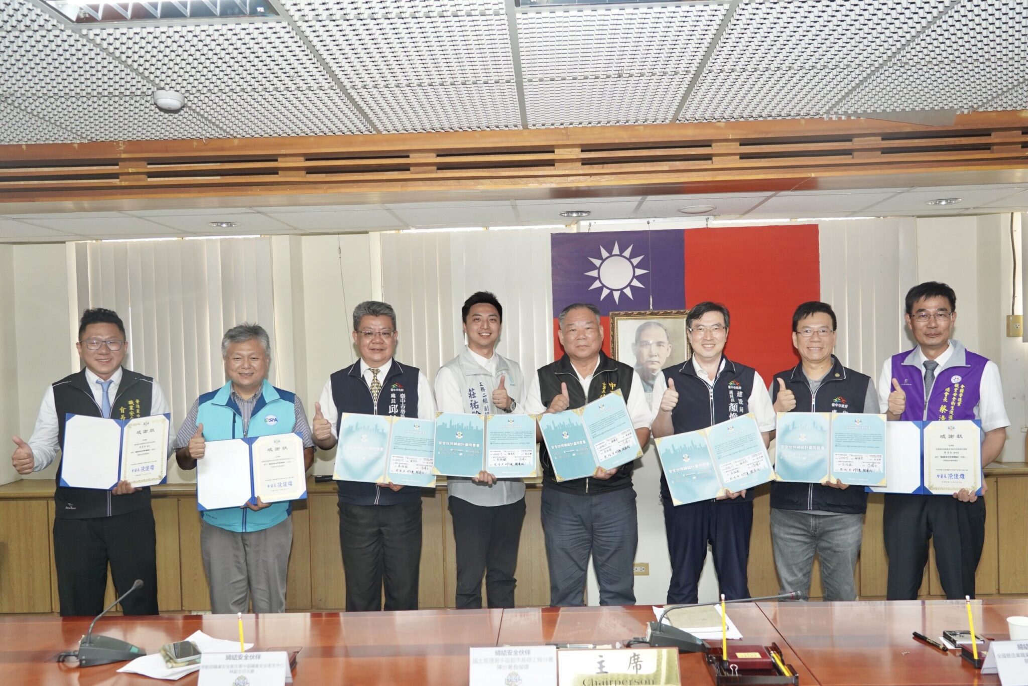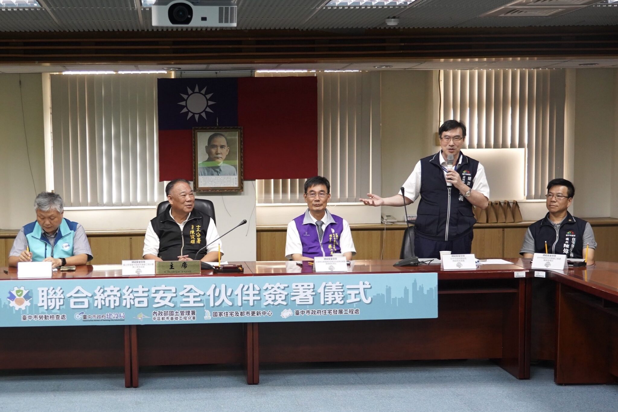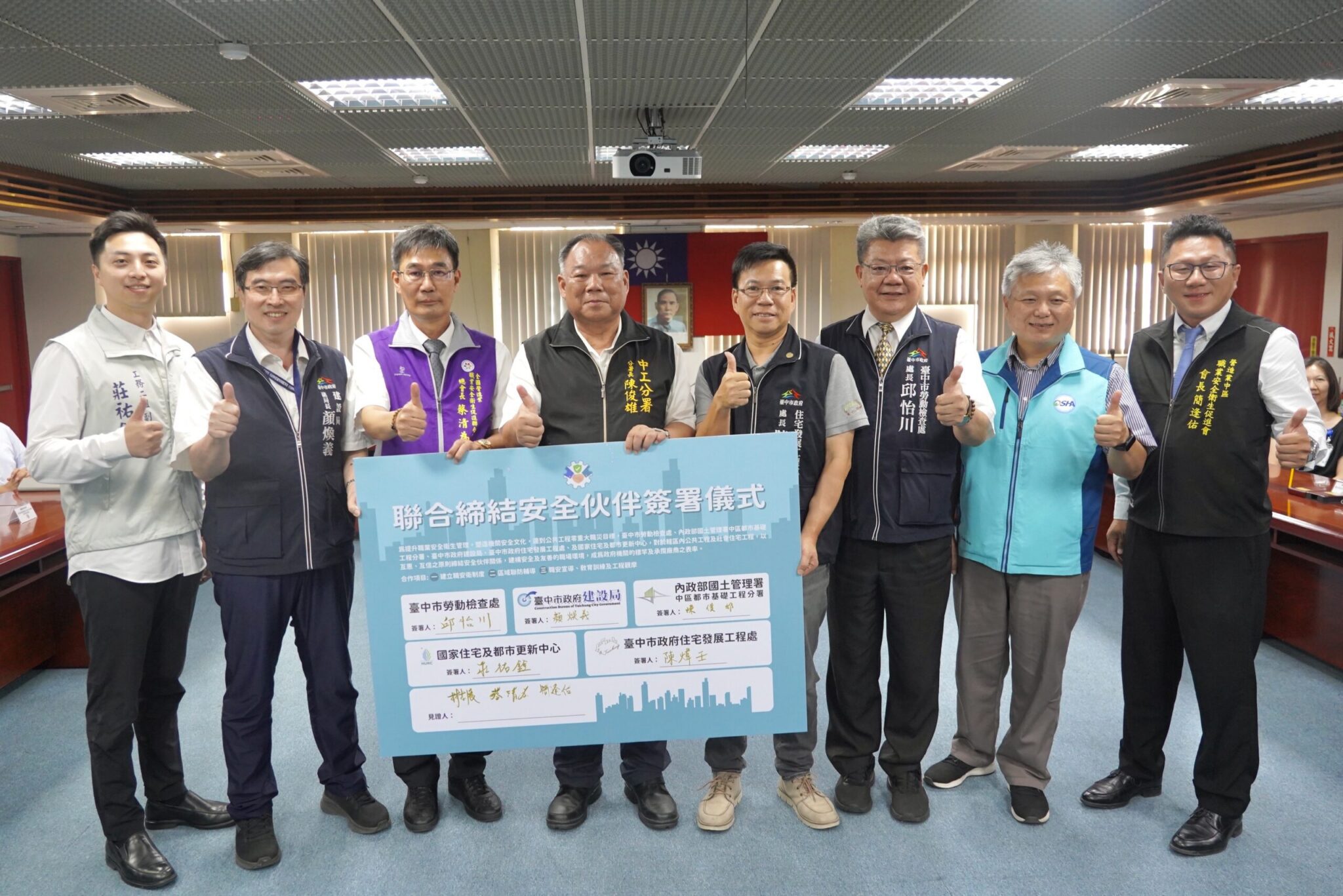 台中市長盧秀燕重視公共工程施工安全與勞工權益,致力推動安全、友善的職場環境。今(25)日市府建設局攜手內政部國土管理署中區都市基礎工程分署、國家住宅及都市更新中心、市府住宅發展工程處及勞動檢查處,共同簽署「安全夥伴協議」,由全國營造業職業安全衛生促進聯合總會長蔡清為、營造業中區職業安全衛生促進會長簡逢佑及勞動部職業安全衛生署中區職業安全衛生中心副主任林志展擔任見證人,並邀請多家規劃設計單位與營造廠商代表出席觀禮,攜手見證這歷史性的一刻。