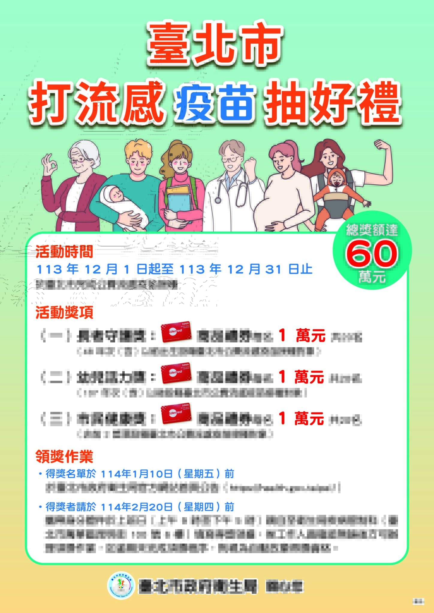每年12月至隔年3月為流感流行期,為鼓勵高風險族群及符合公費資格民眾儘速完成流感疫苗接種,臺北市政府衛生局舉辦「打流感抽好禮」活動,凡設籍北市之公費流感疫苗接種對象,於113年12月1日至31日期間於臺北市之合約醫療院所或疫苗接種站完成公費流感疫苗接種,就有機會獲得1萬元禮券,總獎額達60萬元。