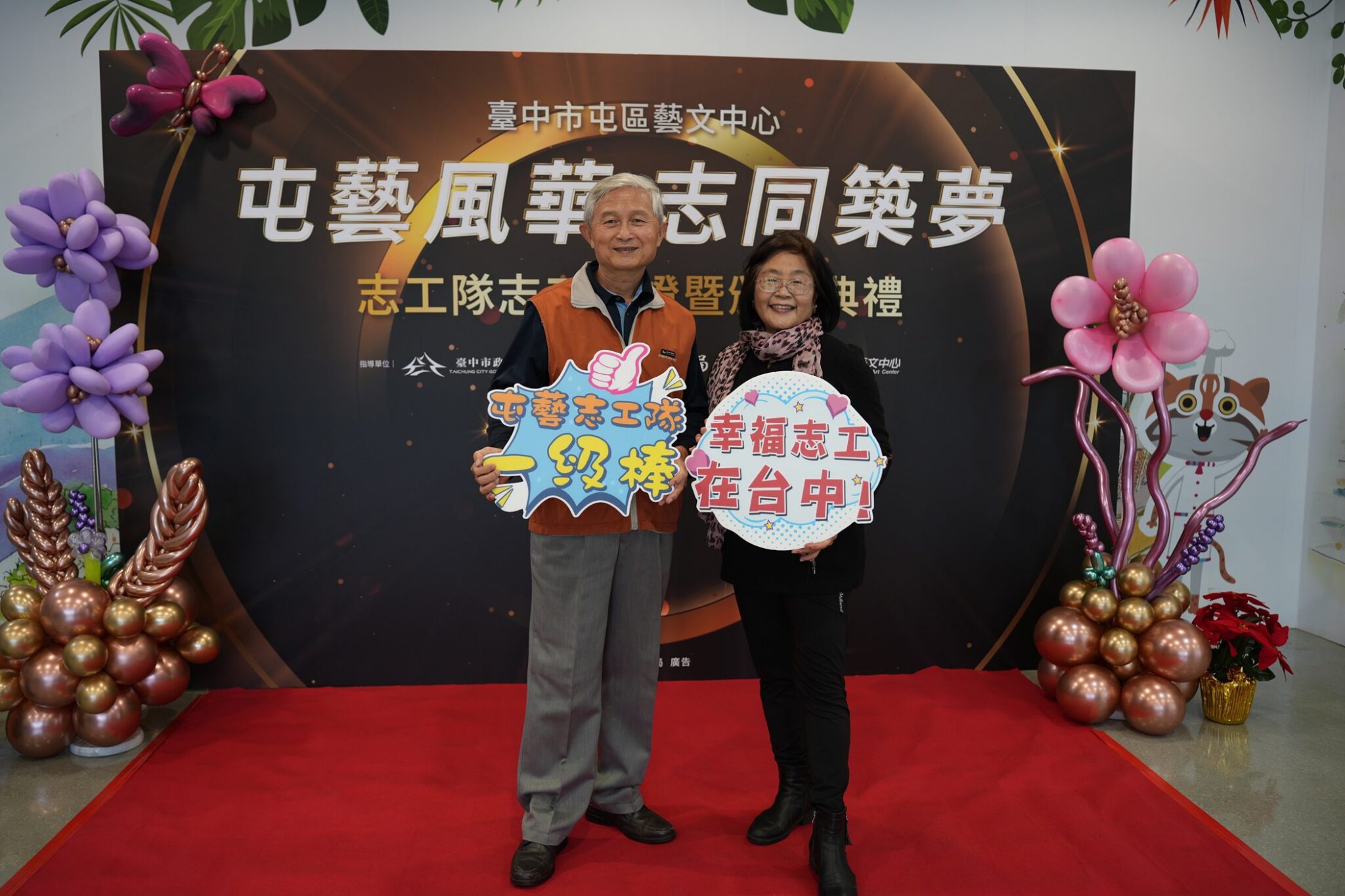 屯藝中心表示,志工隊林麗君與陳建平夫妻檔今年同時獲得台中市志願服務獎勵一等獎,一夫妻二人一起做志工,感情更融洽了!前志工隊長林麗君分享,她自屯藝中心落成時,就因館舍新穎與富涵文化氣息而深受吸引,心中暗下定決心,一定要來當志工。隔年卸下國小主任職務後,終於在102年加入志工隊,並陸續擔任導覽組長、副隊長、隊長,同時也是屯藝學堂的書法老師,向民眾推廣筆墨的各式風采。她的先生陳建平則是在她擔任隊長時加入的,並致力推廣藝術文化與環保理念,兩人搭檔服務逾10個年頭,他們表示當志工最開心的事情就是看到家長能帶著年幼的孩童走進屯藝,文化得以傳承,民眾文化素質愈來愈高,感到無比欣慰!