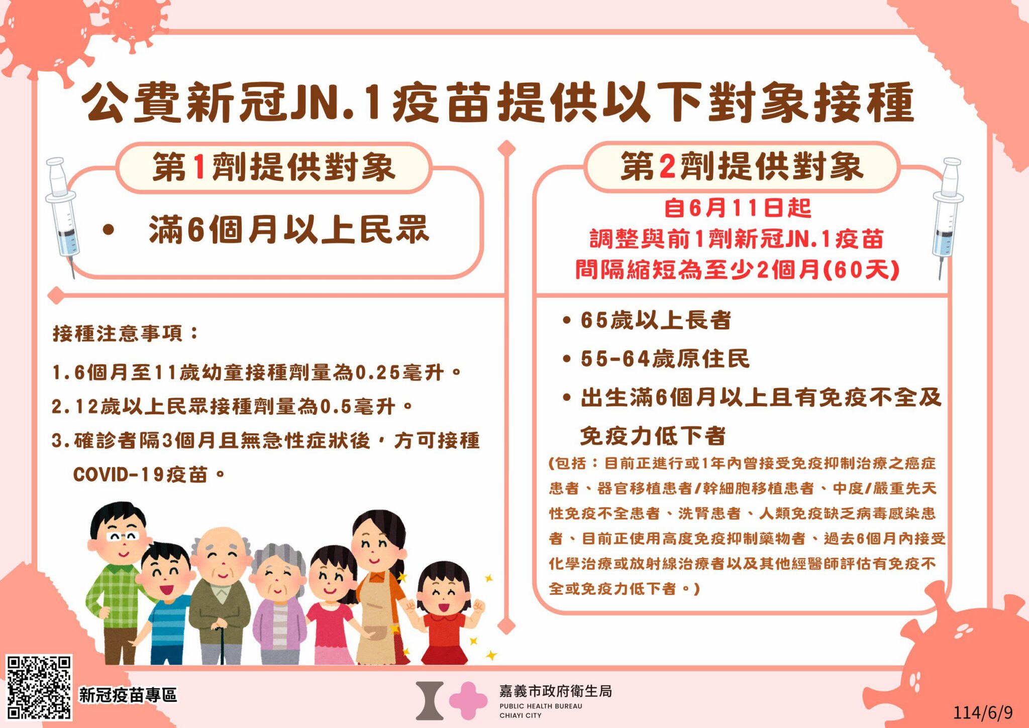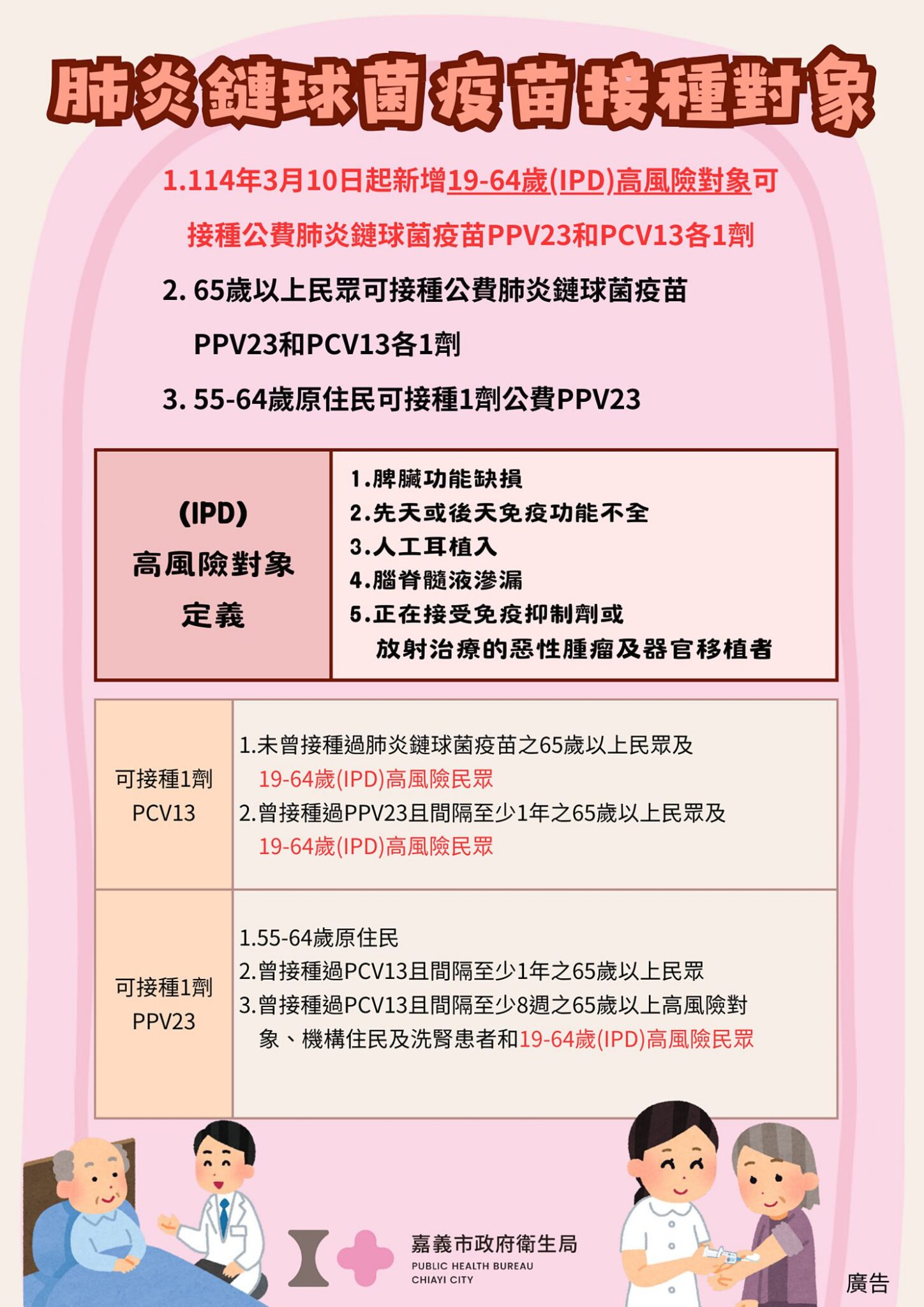 嘉義市政府衛生局廖育瑋局長說明,目前我國提供65歲以上長者及19-64歲侵襲性肺炎鏈球菌感染症(IPD)高風險對象(請出示相關證明)可免費接種1劑13價結合型肺炎鏈球菌疫苗(PCV13)及1劑23價肺炎鏈球菌多醣體疫苗(PPV23),若已完成接種2種不同價型肺炎鏈球菌疫苗者,則無需再接種。如身份為55-64歲原住民可免費接種1劑PPV23;另提供年齡滿6個月以上民眾施打新冠JN.1疫苗,若於113年10月1日後已施打過新冠JN.1疫苗者,則無需再接種,提醒新冠確診者須間隔3個月後再接種。如身份為65歲以上長者、55-64歲原住民、滿6個月以上有免疫不全以及免疫力低下患者,與前1劑間隔至少2個月(60天),便可再接種第2劑新冠JN.1疫苗。