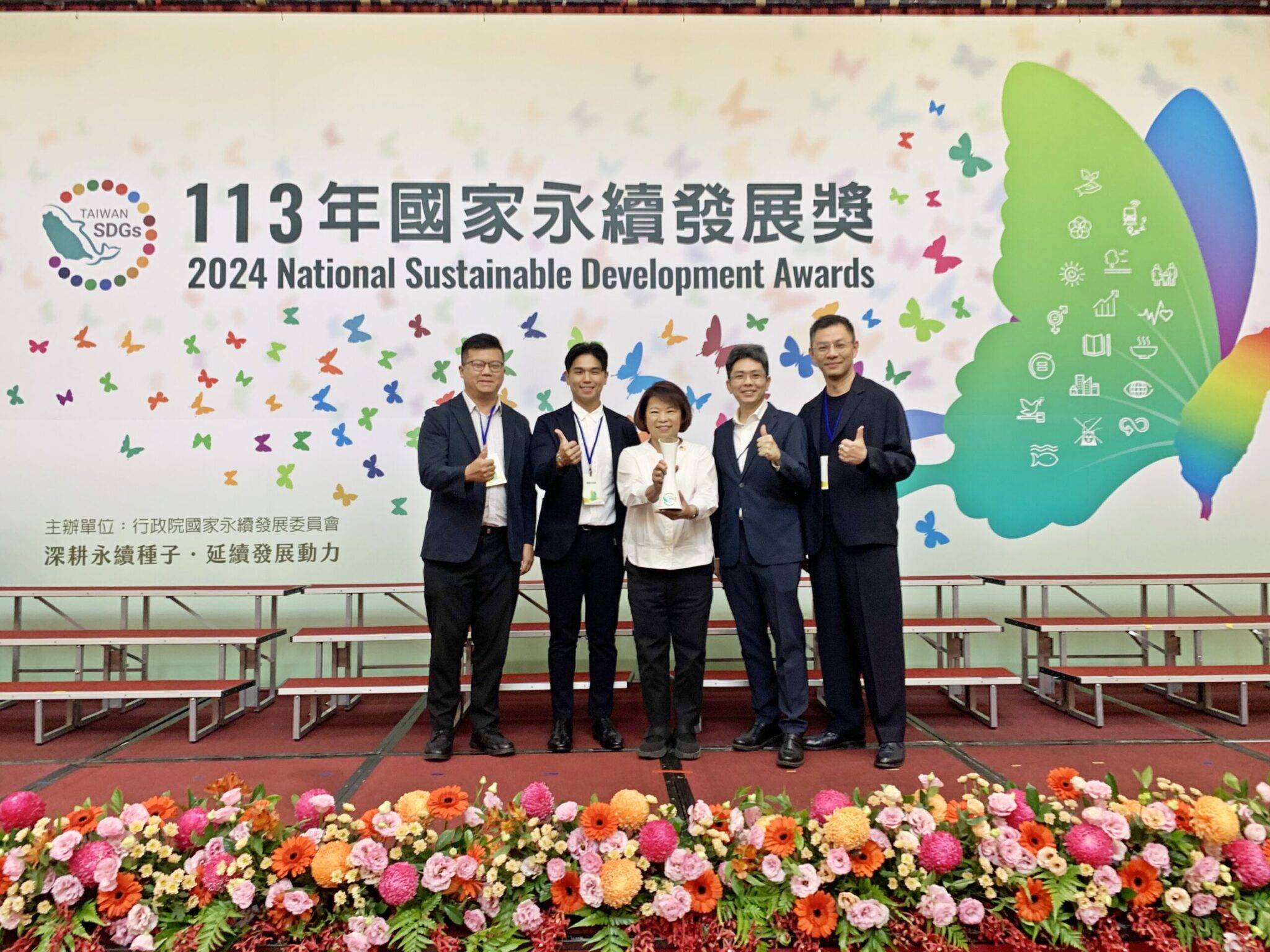 嘉義市政府推動「新永續淨零」再傳捷報!嘉義市政府今(113)年跨局處合作,以「木都嘉義.永續+1」參獎,獲「國家永續發展獎-政府機關類」獎項肯定、嘉義市宣信國小獲教育類入選獎。今(19)日,行政院國家永續發展委員會於台大醫院國際會議中心舉辦頒獎典禮,市長黃敏惠親自率領市府團隊出席,從行政院卓榮泰院長手中接下「政府機關類永續發展獎」獎座與肯定,是本次獲獎單位中唯一以縣市政府參獎的獲獎單位,宣信國小則為該組獲獎單位中唯一國小,展現市府跨局處朝向新永續目標邁步、將永續概念扎根教育的決心,以及嘉義市以「木都嘉義」引領永續淨零時代潮流與永續發展指標施政基底的豐碩成果。