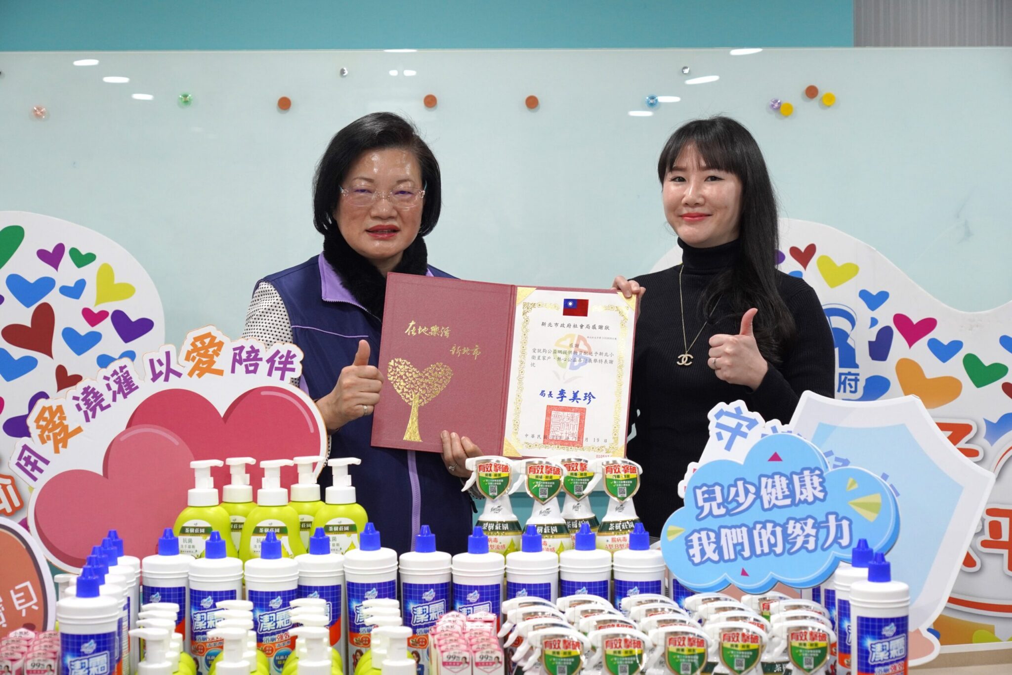 新北社會局長李美珍(左)代表受贈並頒發感謝狀予「愛就夠公益網」秘書長劉沐芸(右)。(新北市社會局提供)