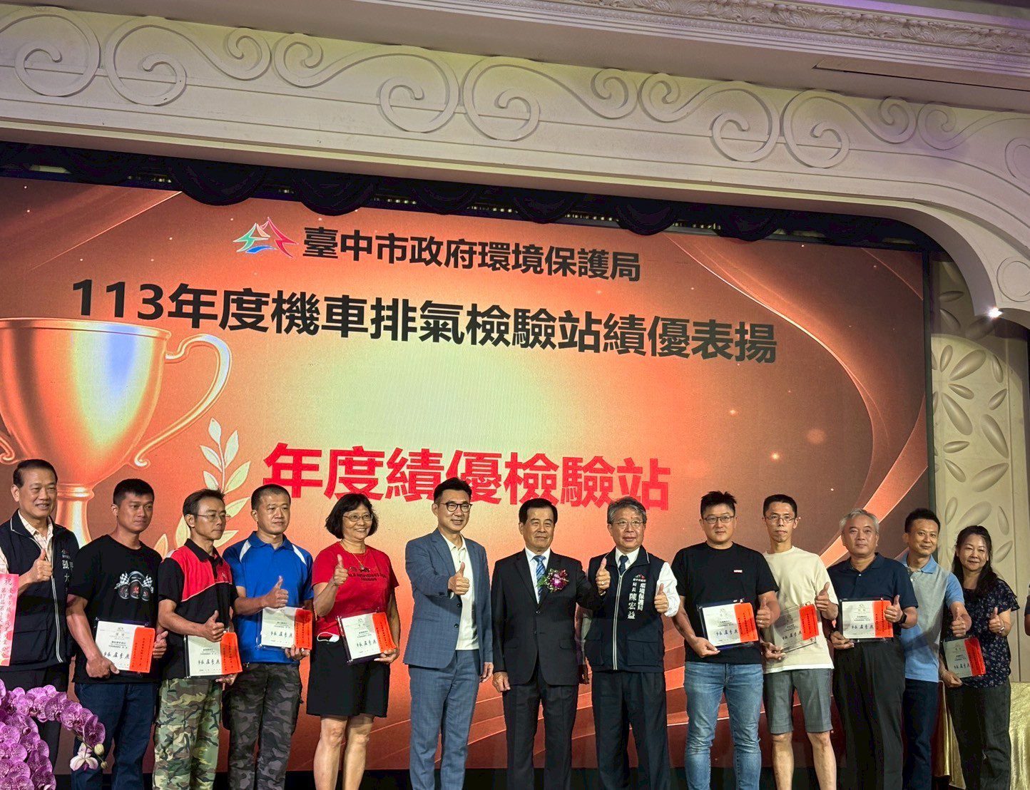 台中市政府環境保護局為提升轄內機車排氣檢驗站服務品質並獎勵表現優異的業者,昨(28)晚於潮港城國際美食館辦理「113年度台中市機車排氣檢驗站績優表揚」,公開表揚榮獲「年度績優檢驗站」及「機車檢驗數績優獎」等優良業者,並由立法院副院長江啟臣頒發績優獎牌及獎金,感謝他們守護台中空氣品質的努力與貢獻。