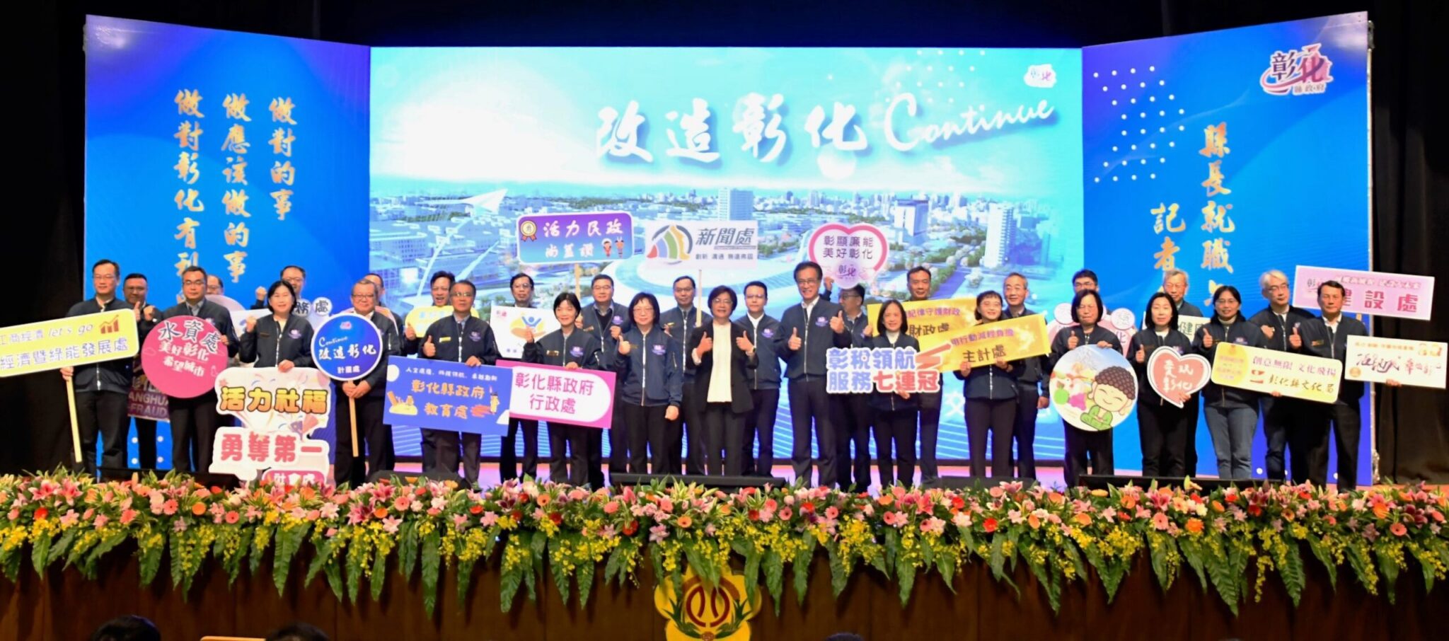 現場播出王惠美就任六年政績回顧影片,王惠美在縣府團隊的協助下,從一上任接手財政崩潰的窘境,一步步重整財政紀律,開源節流,上任第一年(108年)縣總決算歲入出差短,創近20年來首次由虧轉盈,更連續5年,年年賸餘,5年減債107億元,為縣市組排名第一,有財政穩健,才能讓施政的每一步走得更加扎實;經過六年持續努力,成果逐漸遍地開花,施政成績亮眼,有136項全國首創、402項全國第一,六年來,無論是全齡照顧、教育投資、產業升級、交通建設,還是打造樂活永續的生活環境,縣府團隊努力描繪出「宜居新彰化」的永續發展藍圖。