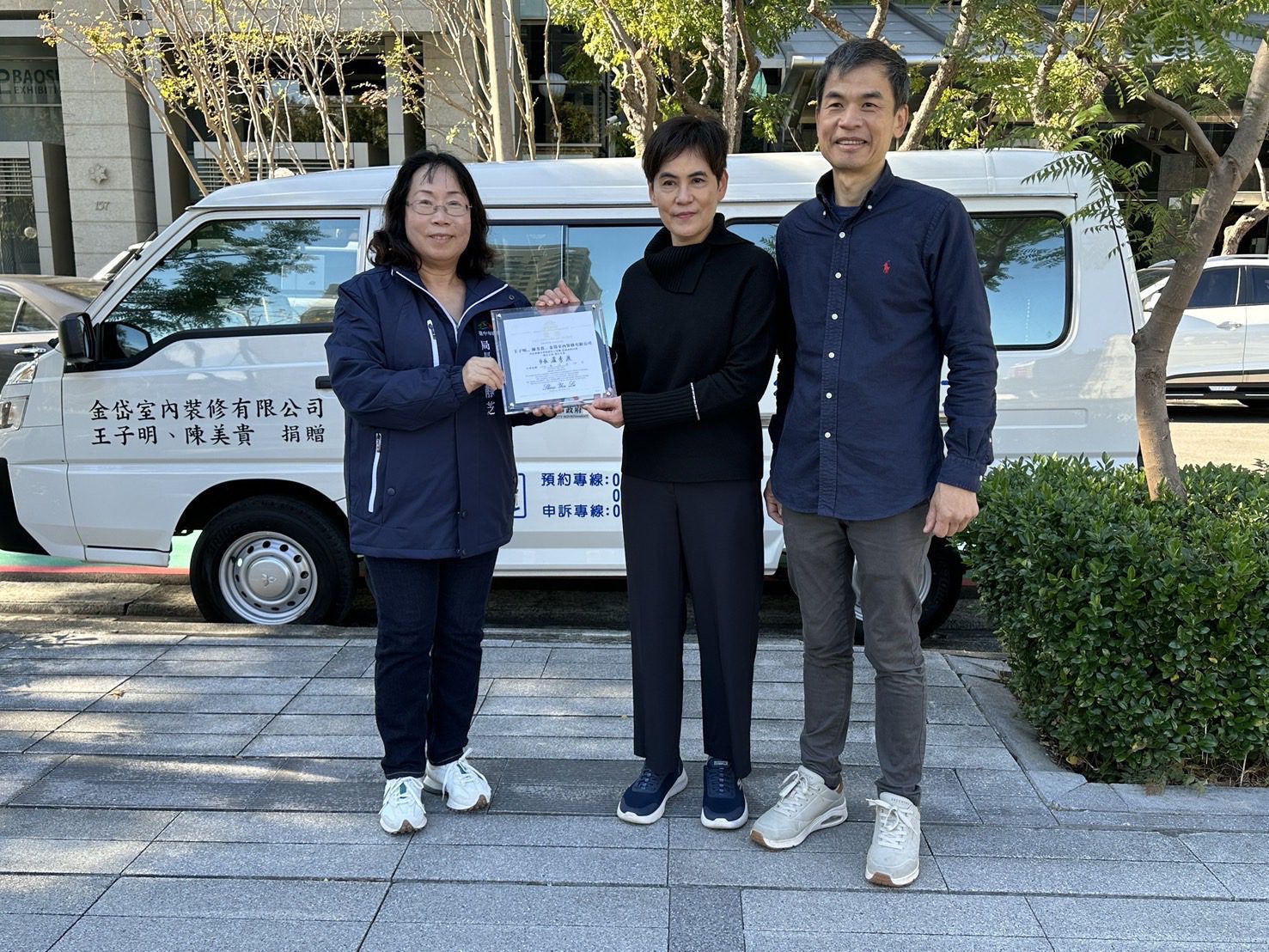 取之社會用之社會,回饋地方鄉里,金岱室內裝修有限公司王子明先生與陳美貴女士,今(26)日共同捐贈台中市政府1輛平頂復康巴士,由台中市社會局長廖靜芝代表受贈,感謝企業不但經營有成,行善更是不遺餘力,造福身心障礙朋友,方便就醫、復健等交通接送,增加社會參與。