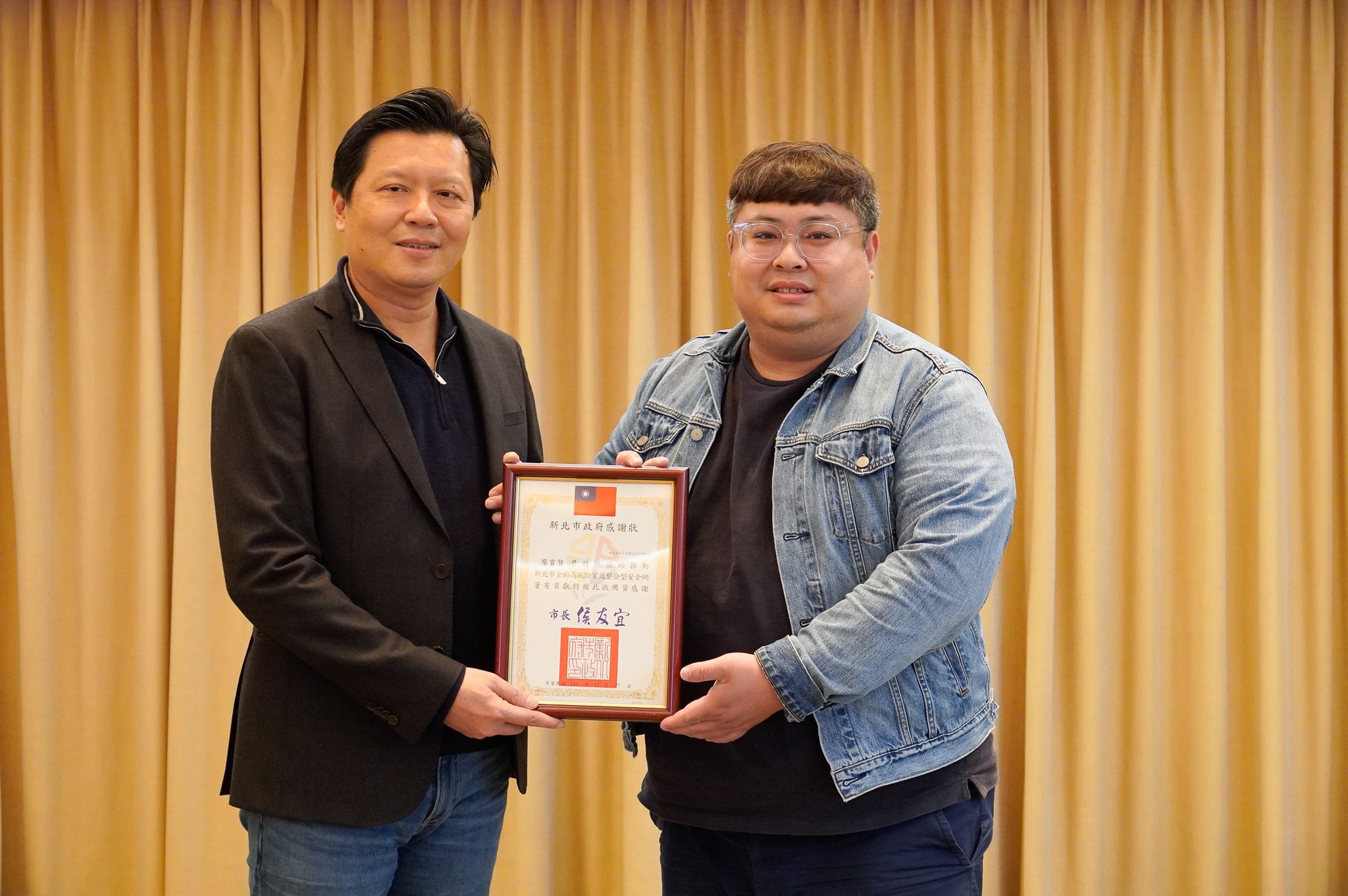 新北市政府27日在跨局處工作會議上表揚新北高風險安全網有功人員,包含里長、警消、輔導老師、社工、護理師、照管專員、訪視員、就服站輔導員及社區發展協會等40人,由市政府副市長朱惕之頒獎,同時為高風險家庭各單位一線服務人員獻上感謝。