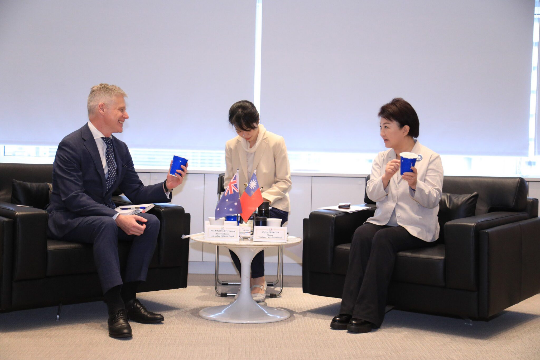 澳洲辦事處馮國斌代表一行今(4)日拜會台中市政府,由市長盧秀燕接待,盧市長首先端出台中珍奶破冰,雙方就台澳在經濟、教育、觀光、能源等多元領域的合作深入交流。市長表示,台灣天然資源有限,而澳洲包括礦產等天然資源豐富,雙方在能源領域具高度互補性。台中與澳洲一直保持密切關係,未來將進一步強化雙邊合作,期盼透過持續互動,促進彼此的經貿發展與城市交流。