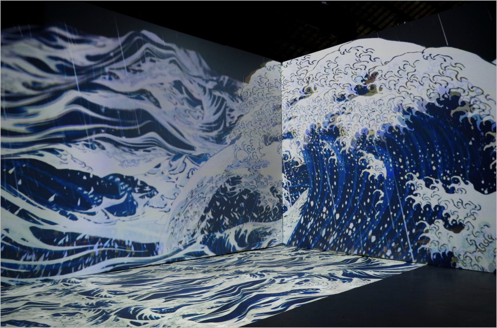 探索浮世繪中水的千姿百態——波浪、雨景、江海交融。透過沉浸式影像技術,重現浮世繪大師捕捉水瞬間變化的洞察力與筆觸。靛藍色調的夢幻空間中,觀眾將感受到水的力量與美感,以及日本藝術家一生追求的「水的表現」魅力。