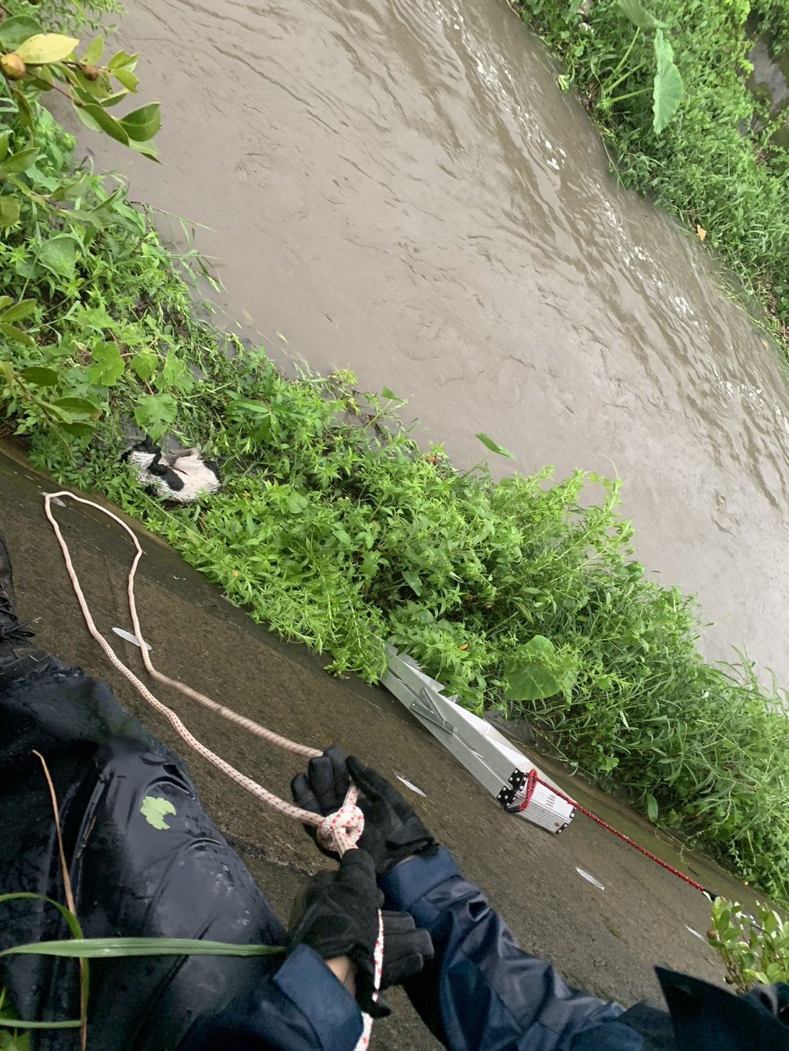 鶯歌區黃先生住家在山區,康芮颱風災後巡視住家附近受損狀況,強風致多處樹木倒塌致大量落葉殘幹堆積道路無法通行,暴雨引起土石崩落河道溪水暴漲。黃先生途中發現一黑白犬在河道堆積樹枝殘幹間動彈不得,因溪水持續暴漲恐淹沒犬隻,經聯繫動保處,動保員團隊現場藉由一人岸上指揮固定綁繩、一人岸邊中繼穩定、一人涉水將受困犬以特殊繩索綁定方式,三方合作安全固定受困黑白犬以接力方式救援上岸。惟因黑白犬疑似摔落河道又遭撞擊致後腿斷裂骨頭裸露、滲血血染身體怵目驚心,因泡在水中已有一段時間體溫過低生命徵象不佳,當日緊急後送毛寶貝醫療中心。