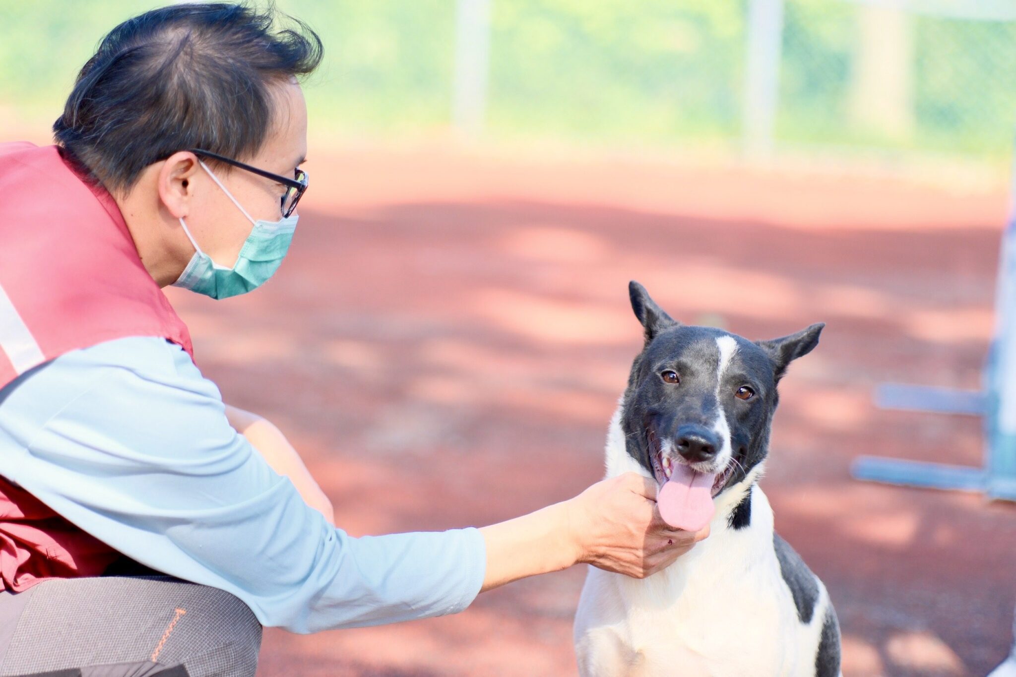 新北市動保處月前接獲鶯歌區黃先生報案指出,颱風災後巡視山區住家附近道路,發現一犬受困暴漲河道樹枝殘幹間動彈不得。因溪水持續暴漲恐淹沒犬隻,經聯繫新北市政府動保處,動保員藉由綁繩涉水將受困犬接力救援上岸。因該犬後腿骨斷失溫命危,當日緊急後送毛寶貝醫療中心,歷經一個多月治療三腳黑白犬「阿福」已恢復健康活力,在板橋動物之家等待一個溫暖的家。