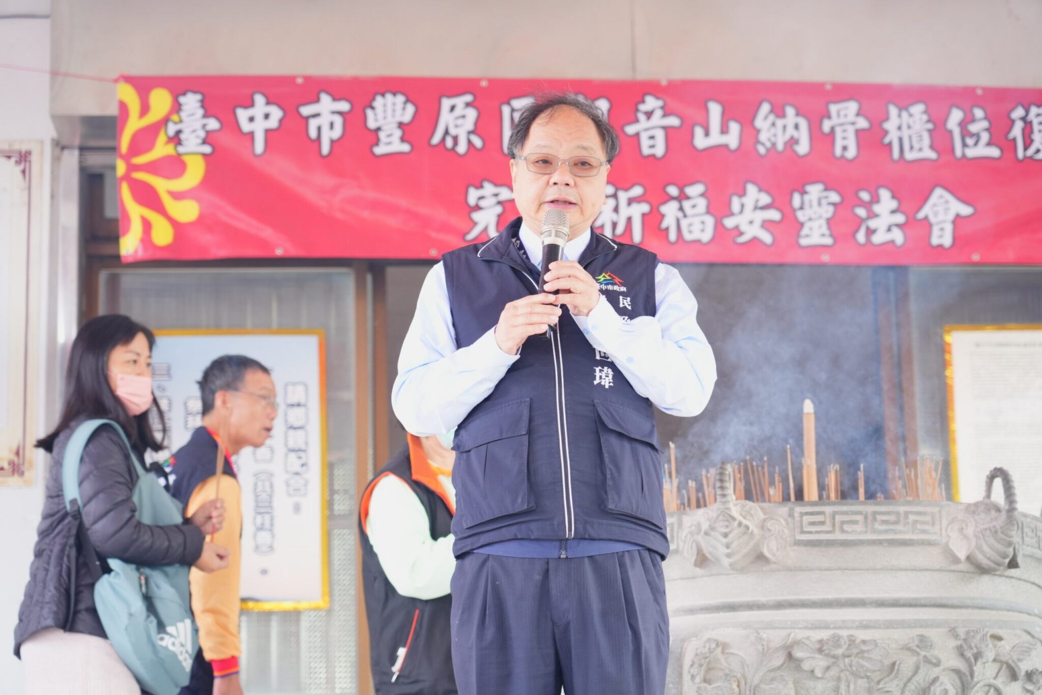 台中市豐原區觀音山納骨堂因今年0403花蓮強震導致5樓部分櫃體受損,市府斥資452萬元啟動修繕工程,歷經9個月,納骨櫃位已於12月整修完工,並將先人的骨灰(骸)罐妥善歸位安置,今(30)日舉行祈福安靈法會,助先靈安穩供奉,讓家屬平和心安。民政局長吳世瑋代表市長盧秀燕前往開香祈福,祈願天地慈悲眾神護佑,安靈息災闔家安康,並祝法會圓滿成功、萬事大吉。