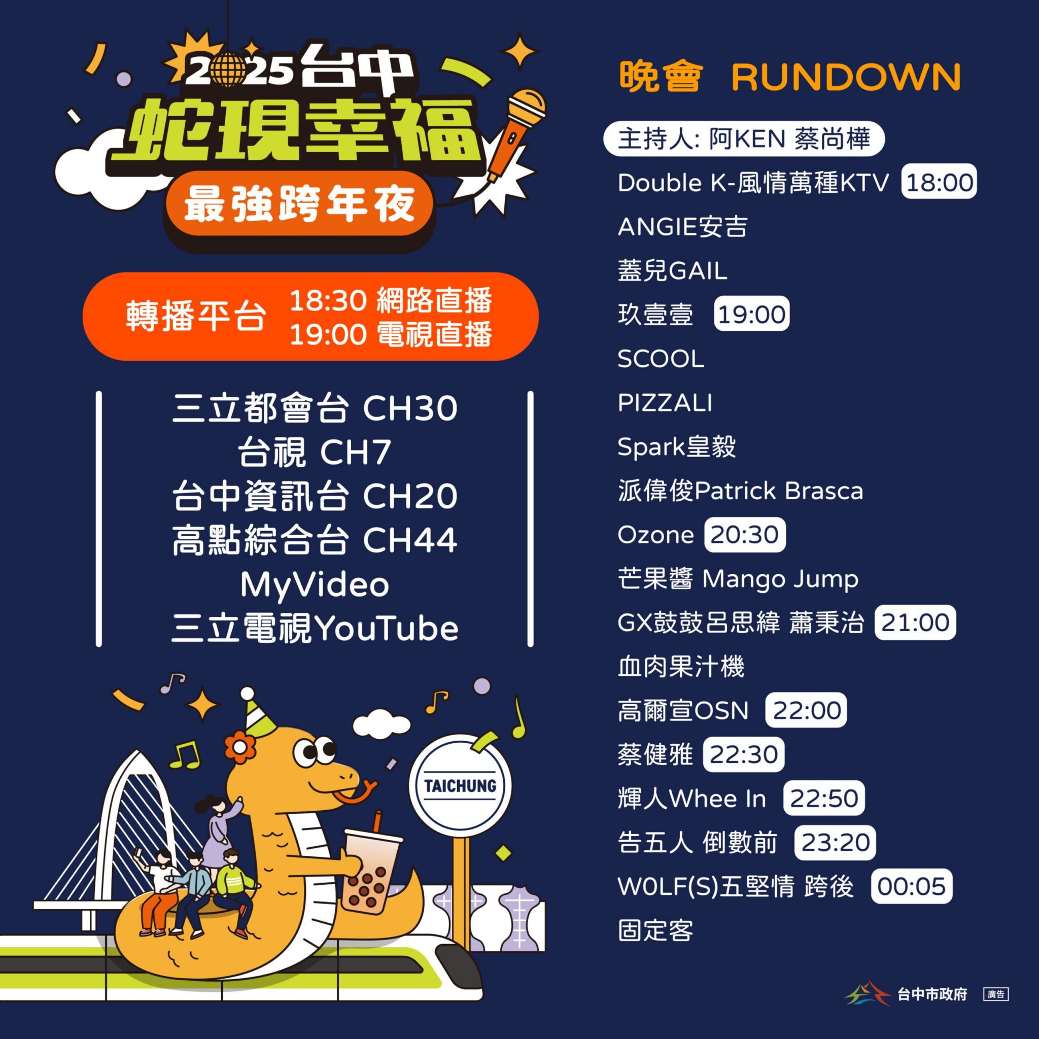「2025蛇現幸福—台中跨年夜」倒數計時,明晚將於台中水湳中央公園一路嗨到1月1日凌晨,台中市政府新聞局長欒治誼表示,台中跨年晚會明(31)日18時開始暖場表演,19時由台中天團玖壹壹開場,22時30分後將有紅遍華人圈的「金曲歌后」蔡健雅「全台唯一」獨家演出,以及韓國「OST妖精」輝人(Whee In)、台灣指標樂團告五人接力壓軸,精采不間斷陪民眾迎接2025!跨年倒數後,人氣男團五堅情W0LF(S)緊接登場,陪伴歌迷共度新年,歡迎全國民眾一起來台中見證逾20萬人的跨年盛會!
